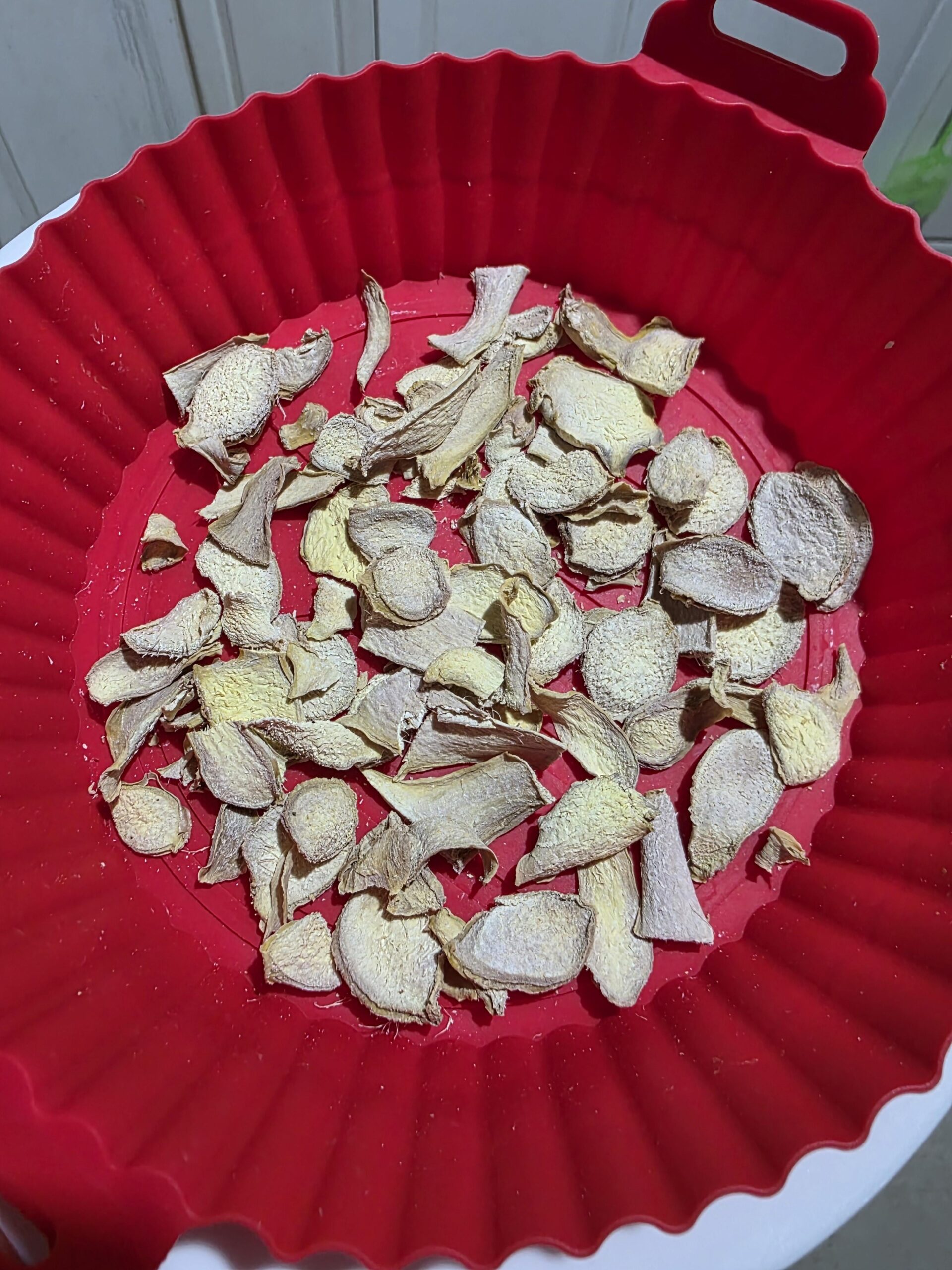 It's pretty convenient to have a few slices of dried ginger slices ready to use. Nothing more disappointing than fishing in the fridge and coming up with slimy ginger.