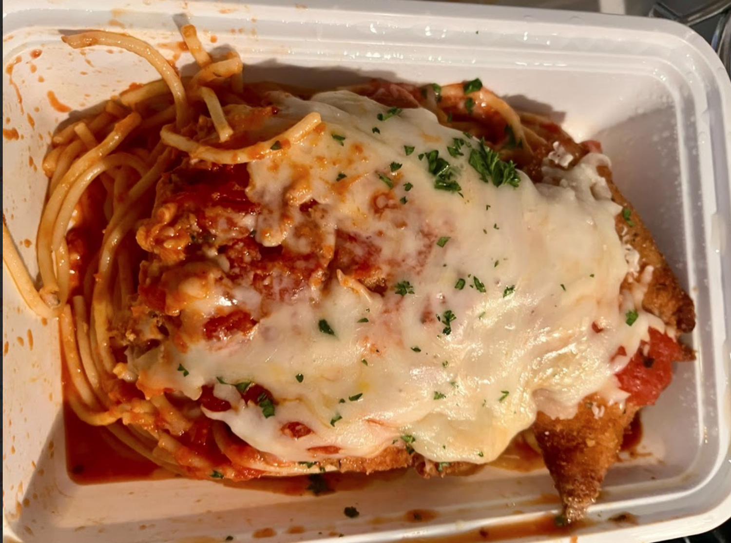 The Chicken Parmesan was a mix of savory tomato sauce, thick and chewy noodles, and crunchy chicken. This chicken’s crunchiness outlasted the fifteen-minute car ride over steaming noodles and sauce in a plastic container. That’s pretty impressive.