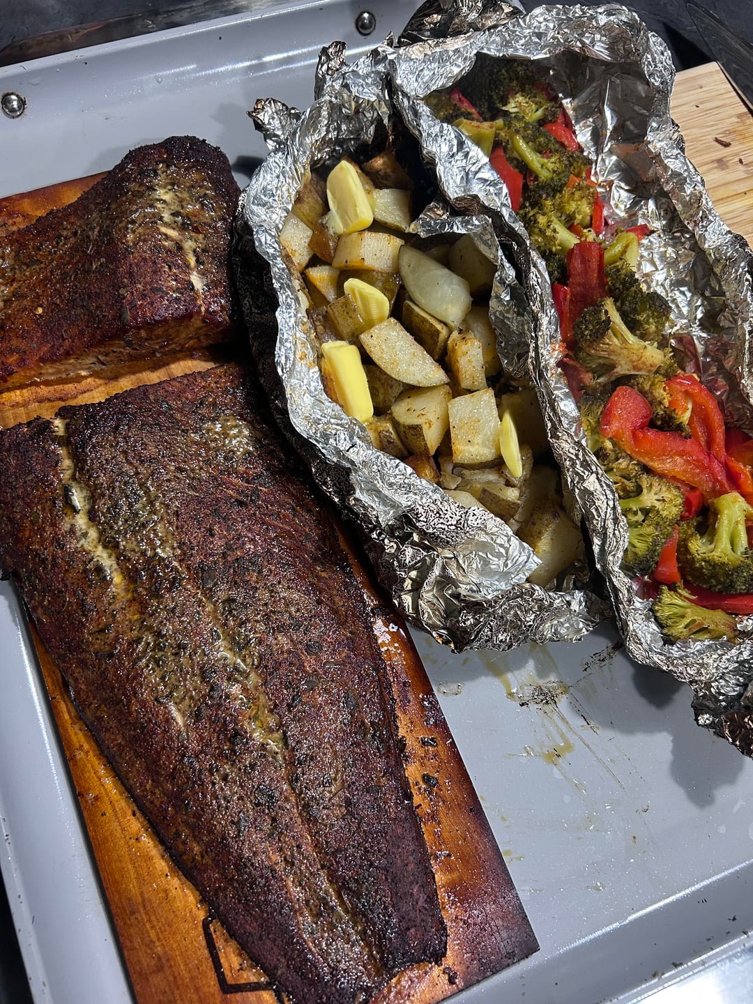 Smoked steelhead for myself and family during this cold front. Something about smoked fish on a cold and rainy evening! Sitting on Cedar planks and apple wood chunks on charcoal. A 10/10 every time. by JCsends 2 Comments BowtiepastaMasta 4 days ago Tremendous, chef. Brainwatch 4 days ago How long did it end up smoking for?