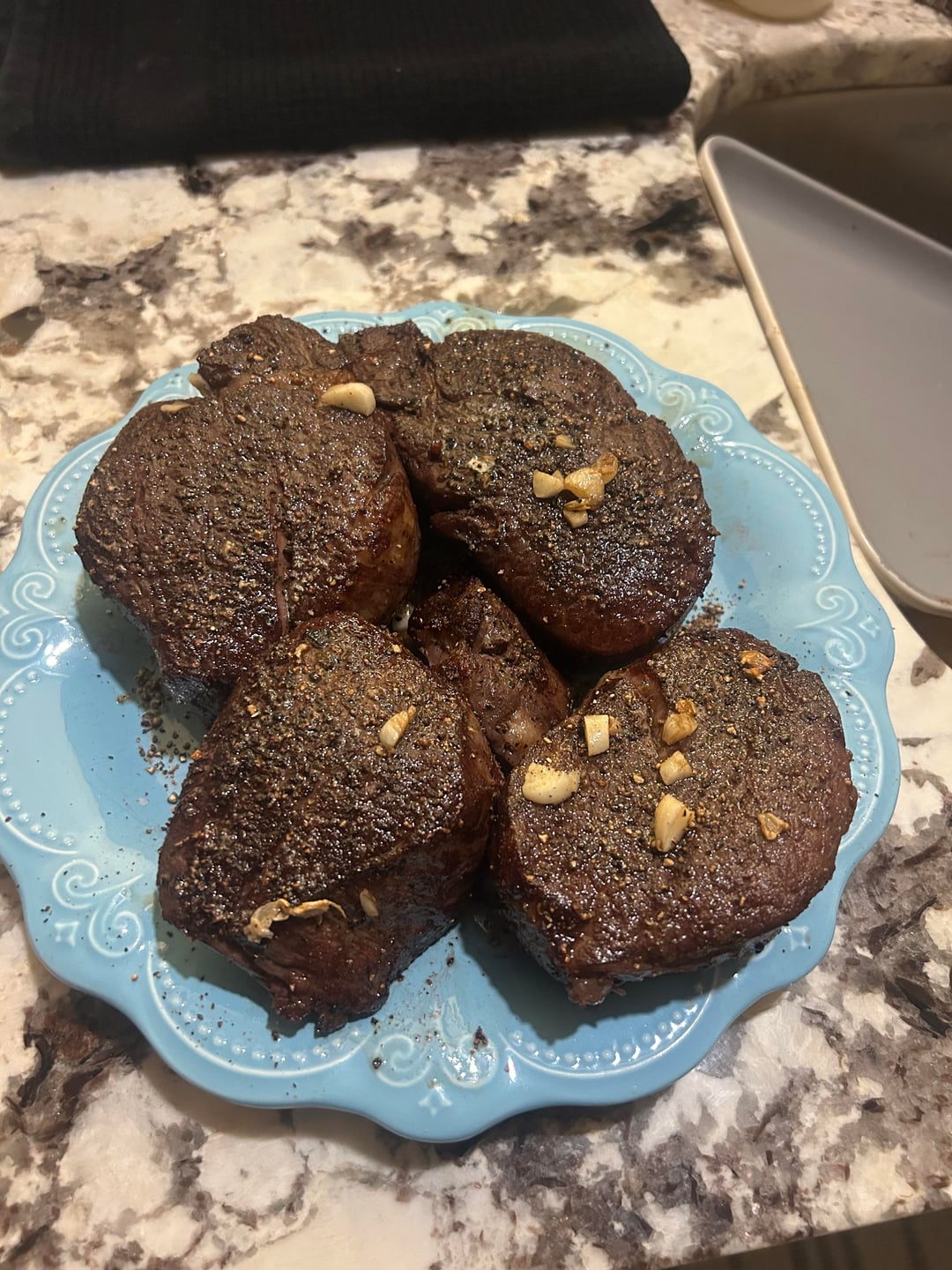 First time doing filet, steaks were frozen from Costco. 133 degrees for 2.5 hours. Transferred to ice bath, removed and patted dry and then salt and peppered up.