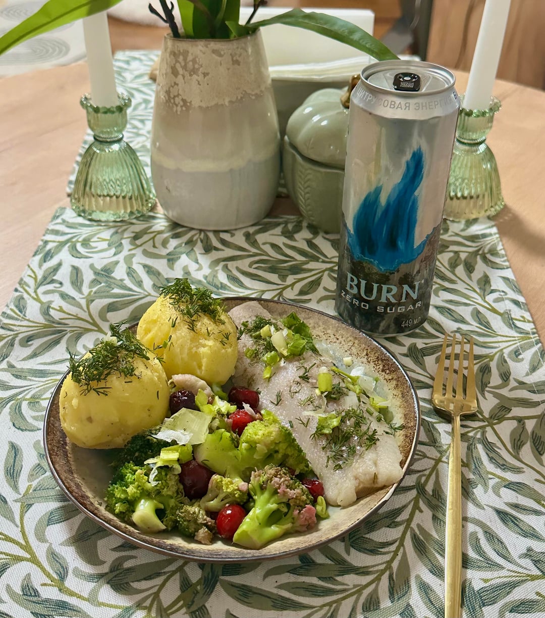 boiled garlic potatoes with dill, herring fillet with lemon juice, garlic lemon broccoli with cranberries and green onion, zero sugar energy drink (321 calories, 23.85 gr of protein)
