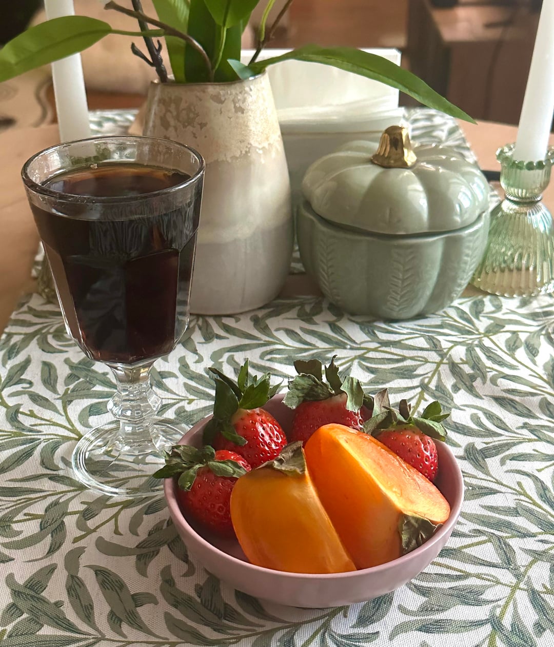 Strawberries, persimmon, zero sugar pepsi (78 calories)