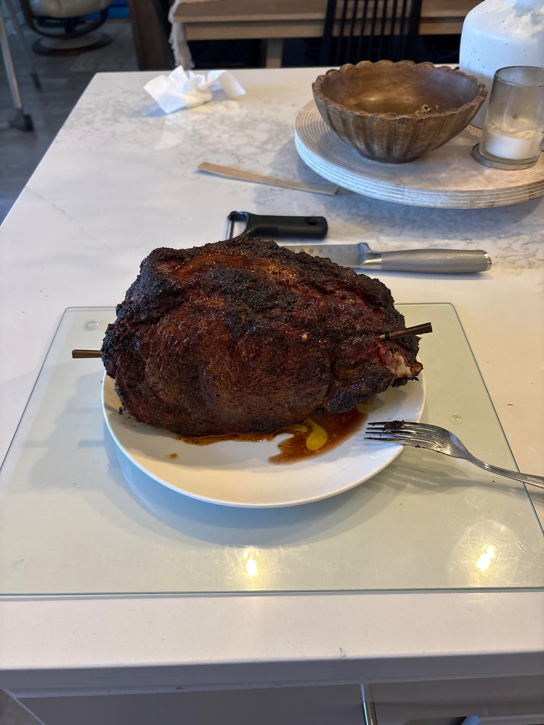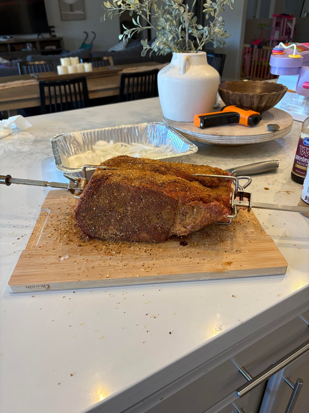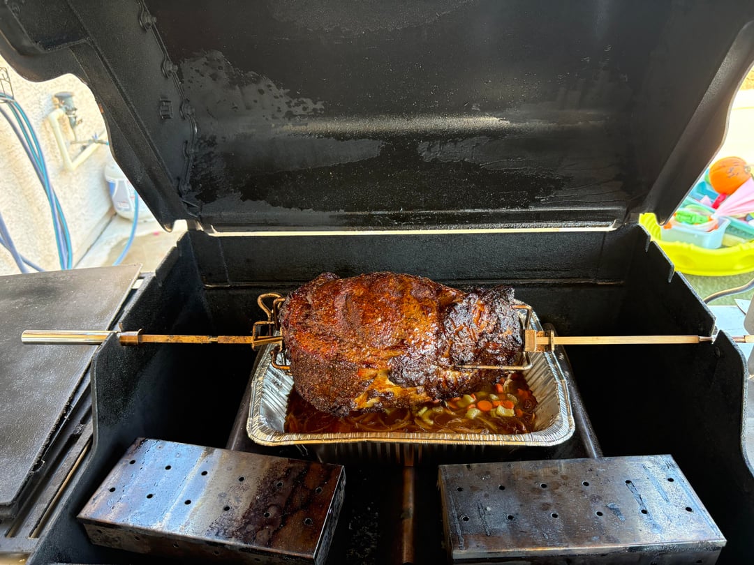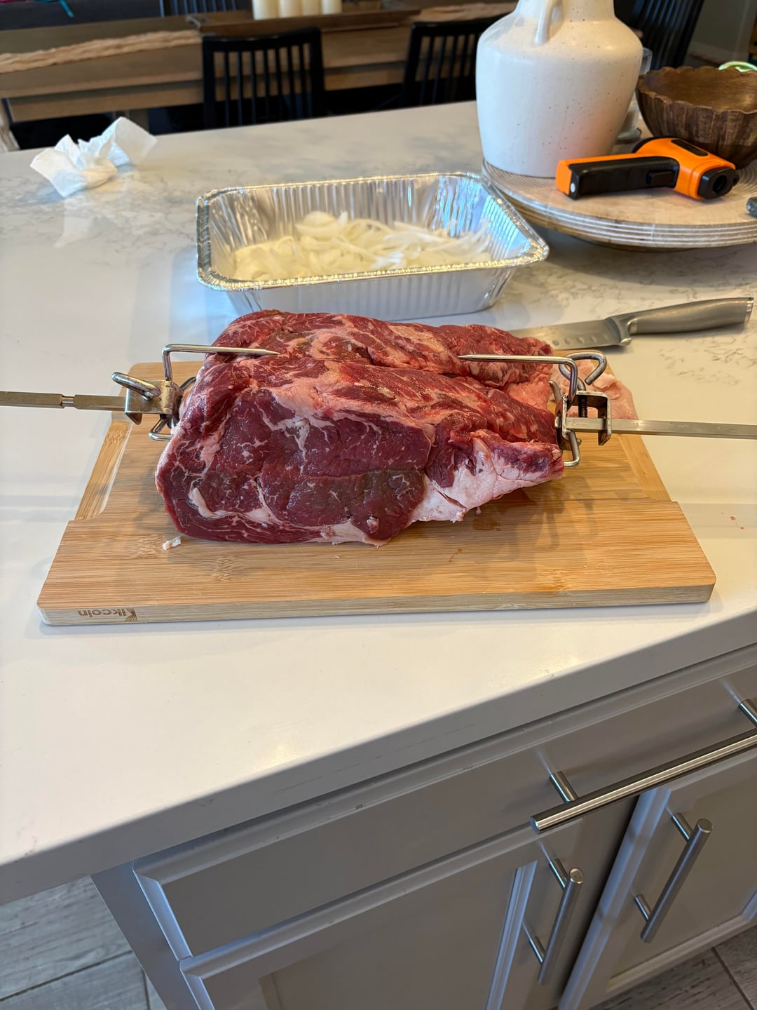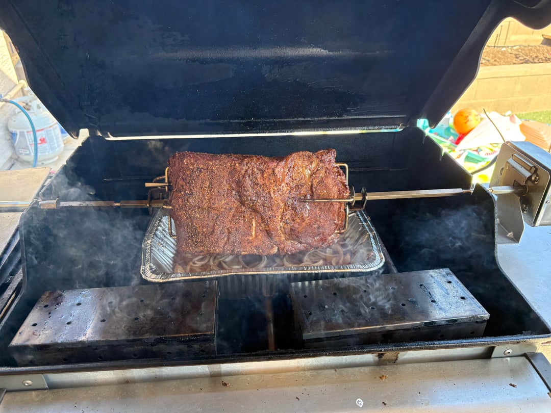 11 steaks and 1 prime rib. Here is the prime rib. Weber spirit gas grill with rotisserie spit. Threw in some smoke boxes with some apple wood chips as well.