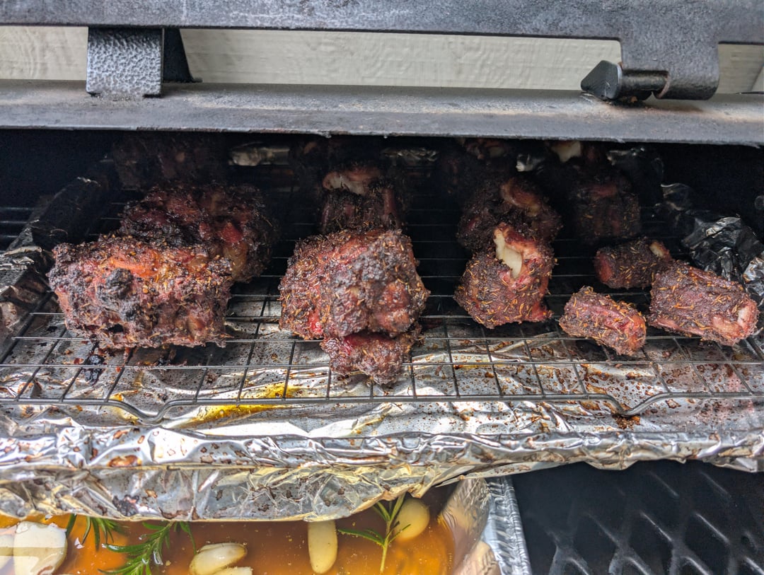First time smoking oxtail. Decided to make some for todays Football games. I smoked them from 250-300F for 3.5 hrs and transferred to beef Tallow with rosemary, thyme, and garlic for another 2hrs.