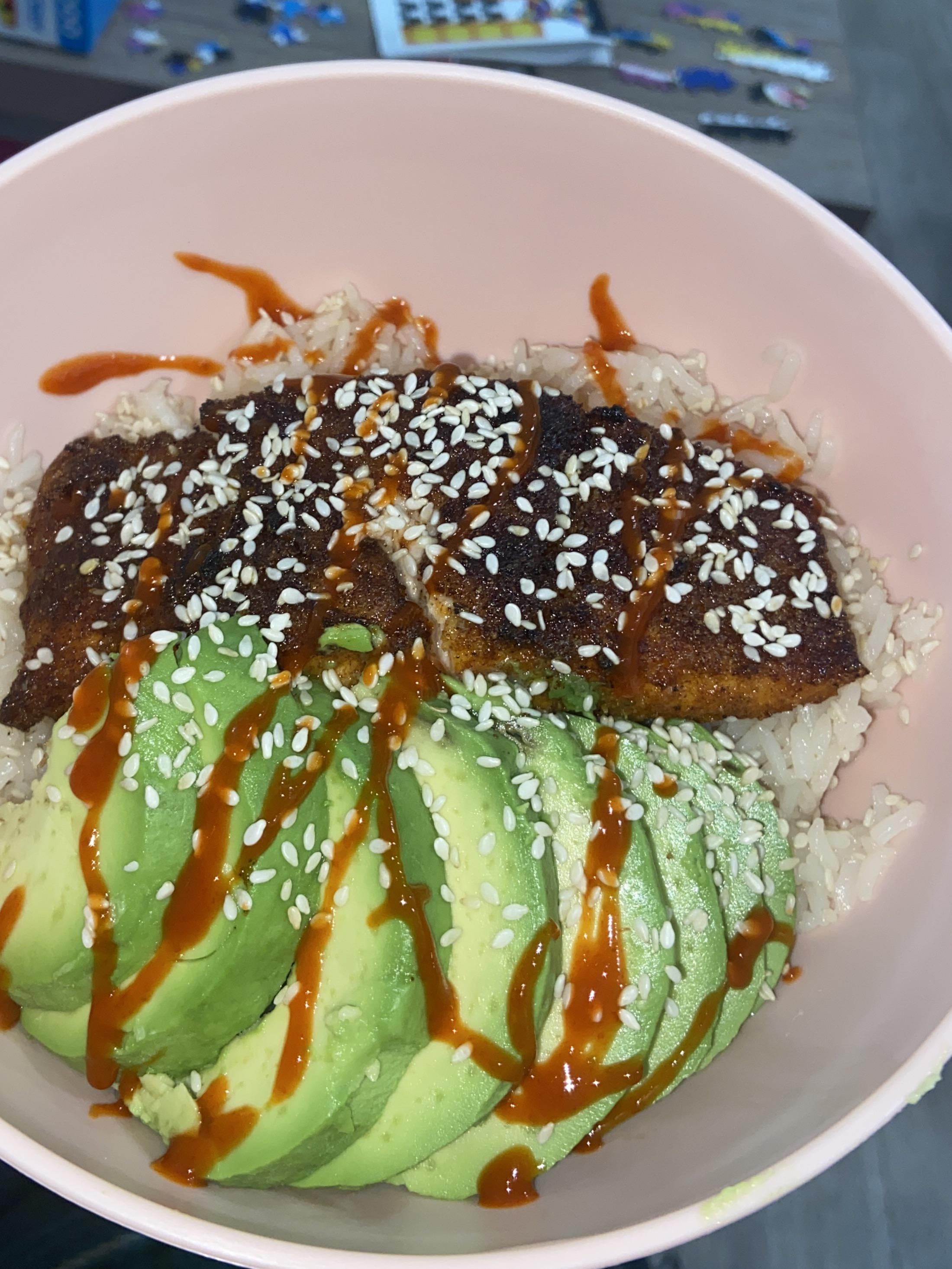 college dorm dinner. salmon cooked in the air fryer and rice cooked in the microwave