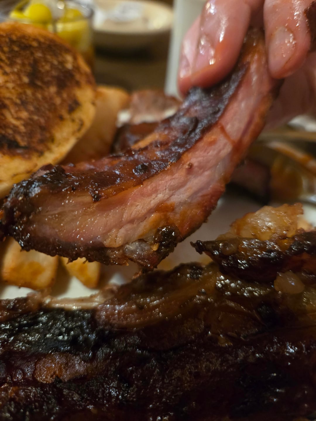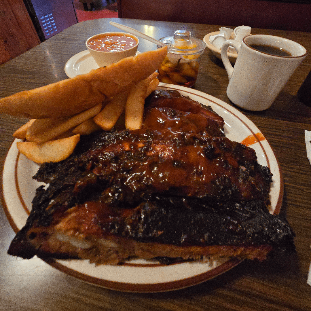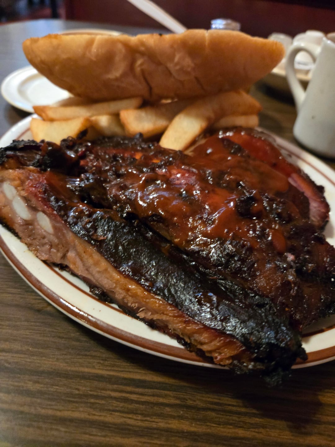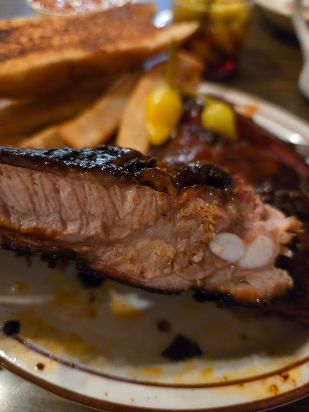 the old stalwart of LA BBQ. has kind of a diner vibe to it. ribs are their specialty so I got a platter with a spare rib, a beef rib, and two baby back ribs. the baby backs (pic 4) were dry, and the beef rib (pic 3) tough and gristly, but the spare rib was actually really notably good. good flavor, nice and tender, good rub that didn't need a ton of sauce in addition. I'd definitely come back but just for spare ribs. the sides were just ok – garlic bread wasn't very garlicky, and the beans are essentially similar to a can of Heinz Baked Beans. but the spare ribs and that sauce, those I can endorse.