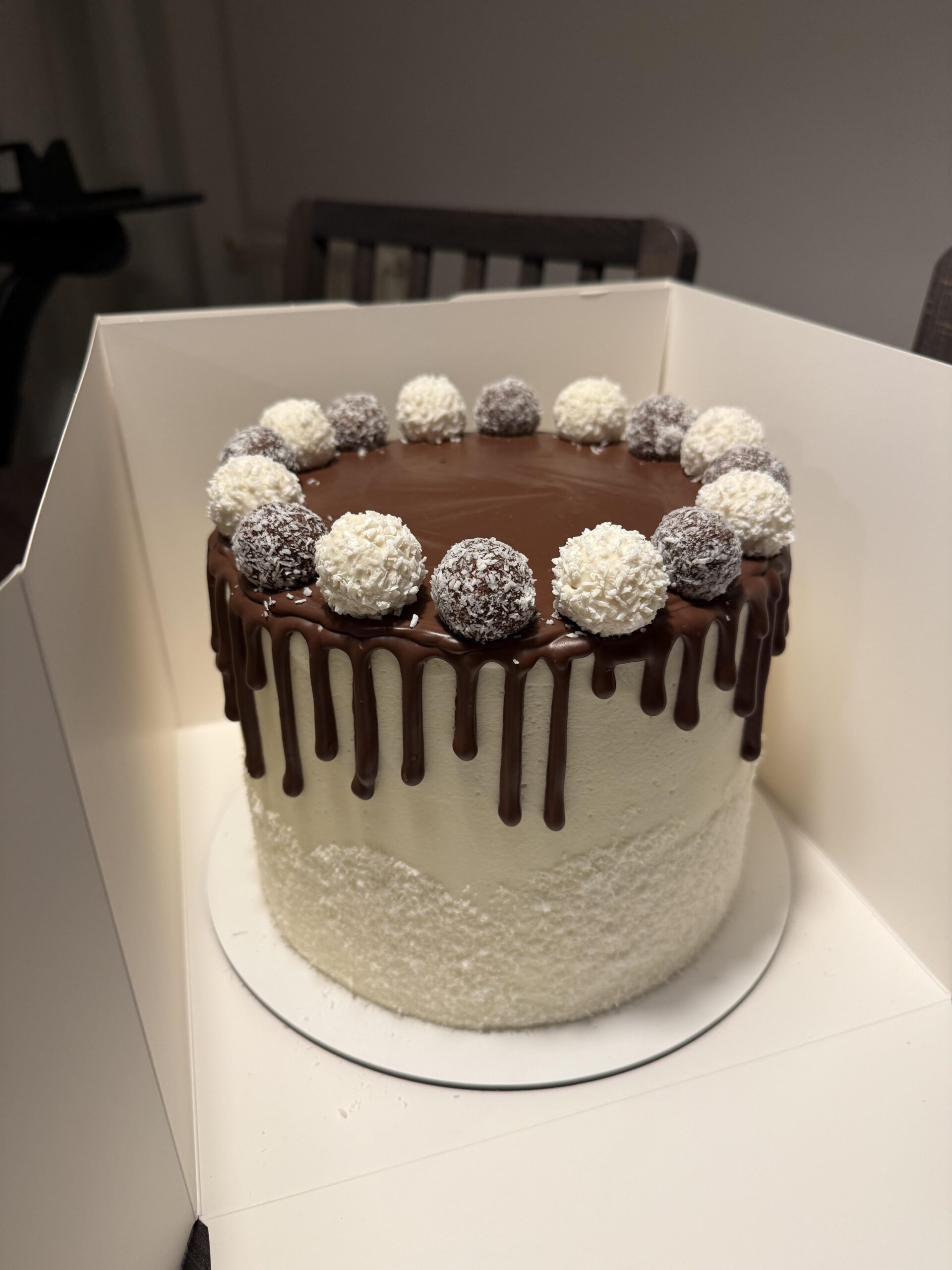 It is a chocate cake with vanilla/coconut buttercream, inspired by a Hungarian recipe.