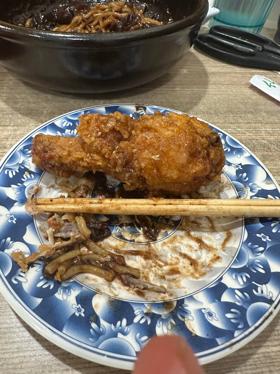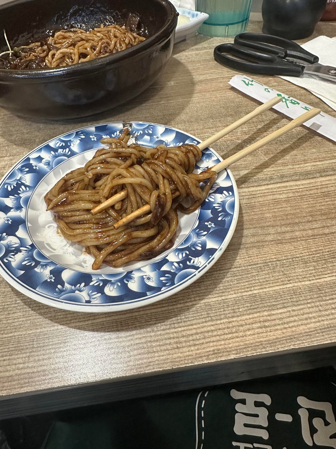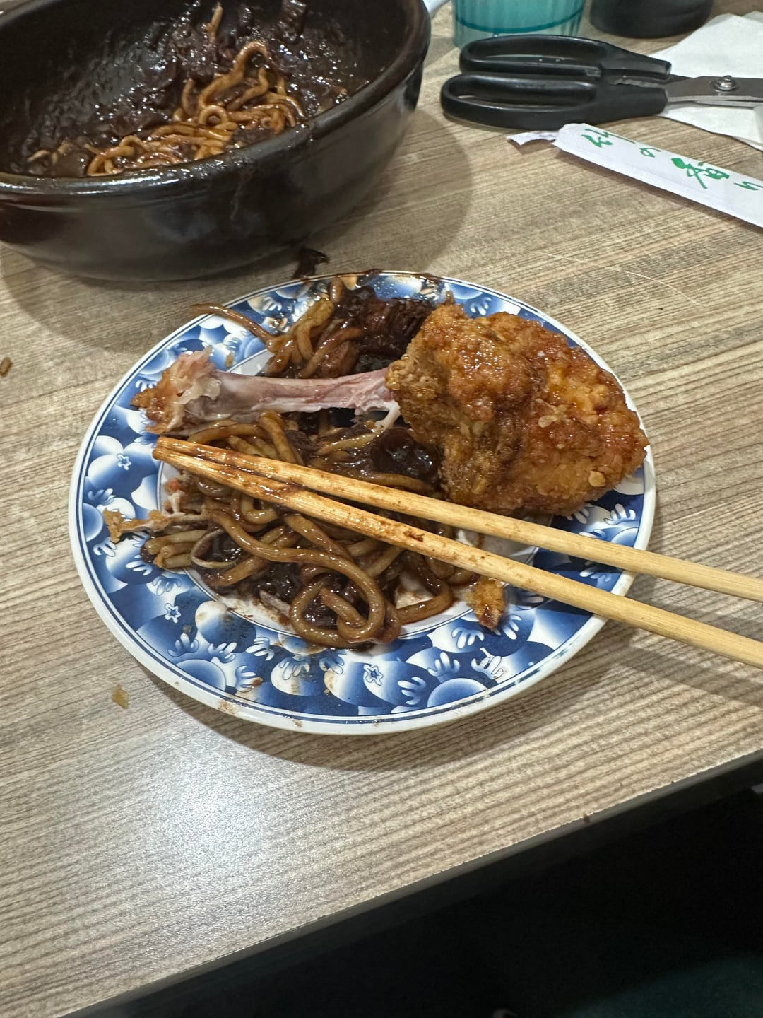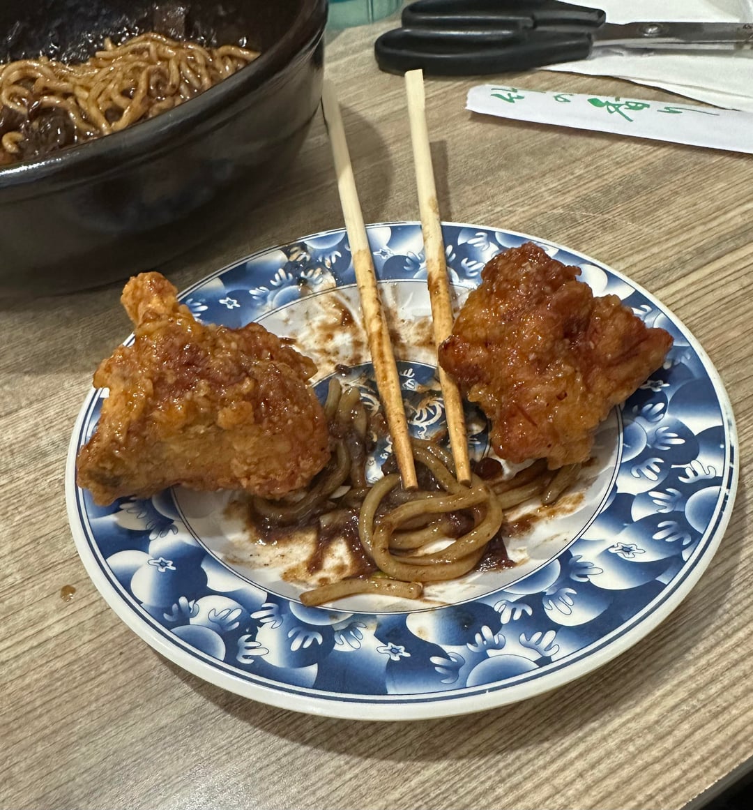 Korean fries chicken, Jjajangmyeon (Korean noodles in black bean sauce), and guava and blackberry sorbet. Pics show how much I ate by Futureworldstar Dining and Cooking