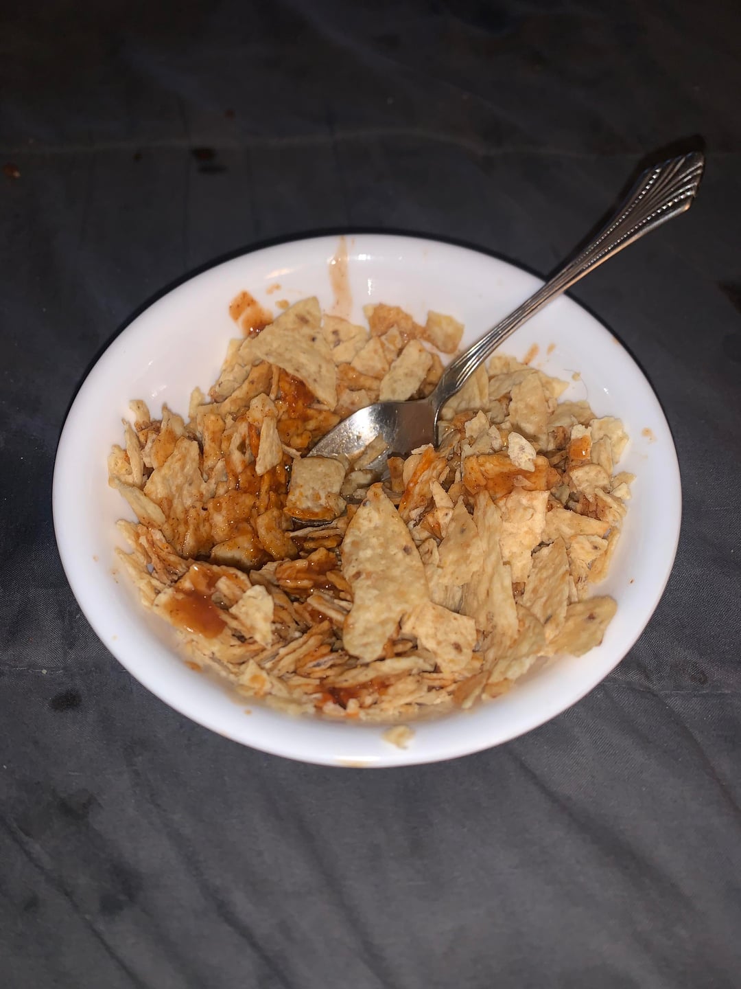 This is the last meal I will eat till Friday. (Payday). It’s Tostitos mixed with some Taco Bell sauce. Tastes ok I guess.
