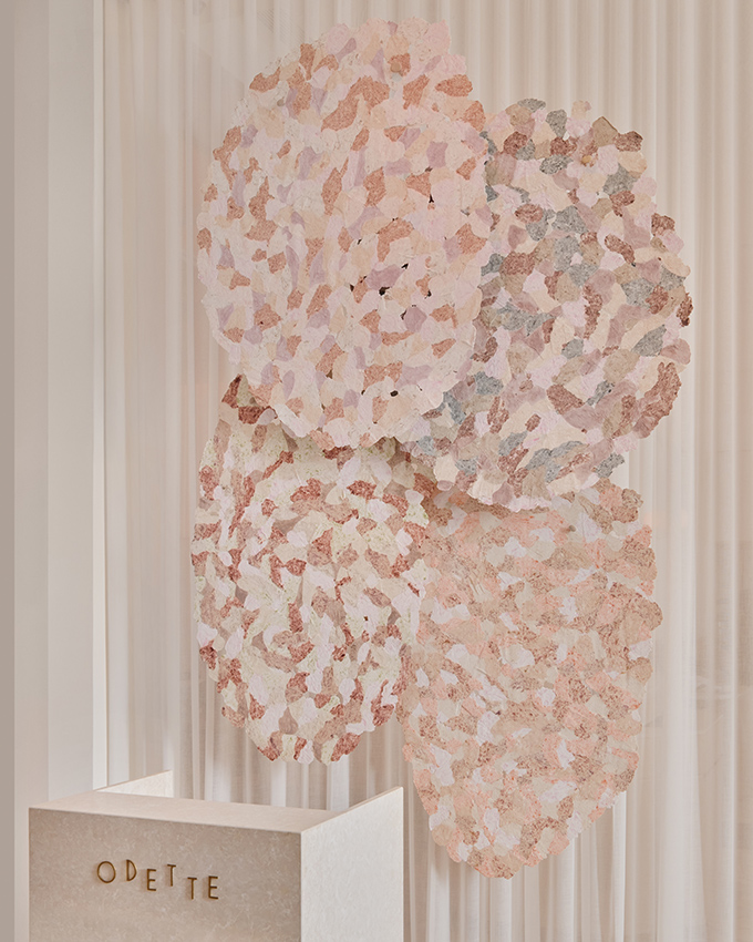 Dawn Ng: I thought a lot about seasonality—of ingredients, flavours, methods of cooking, and, to be honest, seasons in life, especially Julien’s. If the first 10 years of Odette could be considered ‘spring’, then Julien is now in the ‘summer’ of his practice. I asked Julien to create a colour palette of his food for this new season and chapter, which he expressed with a beautiful array of sauces from his kitchen. That seasonal palette, along with the textures of ingredients he works with, form the basis for the hanging paper sculptures you see in the space.