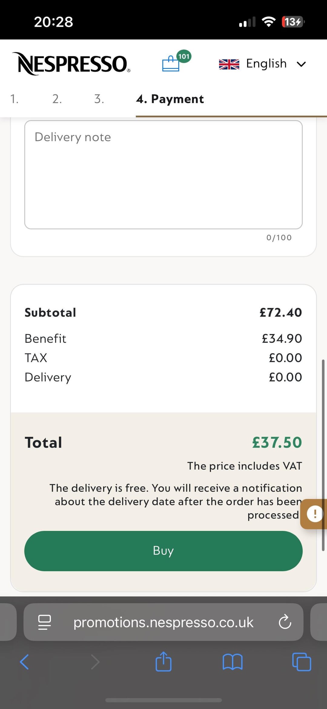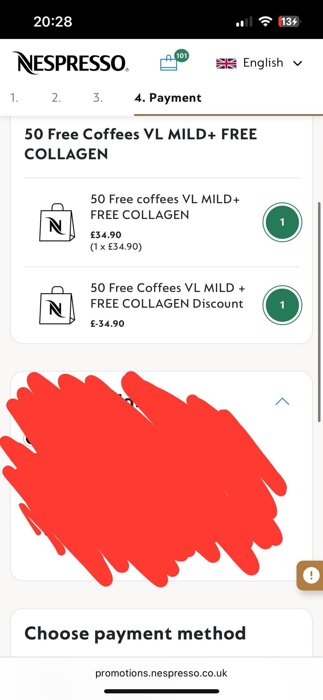 Hi, I very recently bought a Vertuo machine and on the website it says I can claim 50 free coffees plus a tub of collagen. All great. When I pick my coffees and get to delivery, it says I have to pay £37.50?