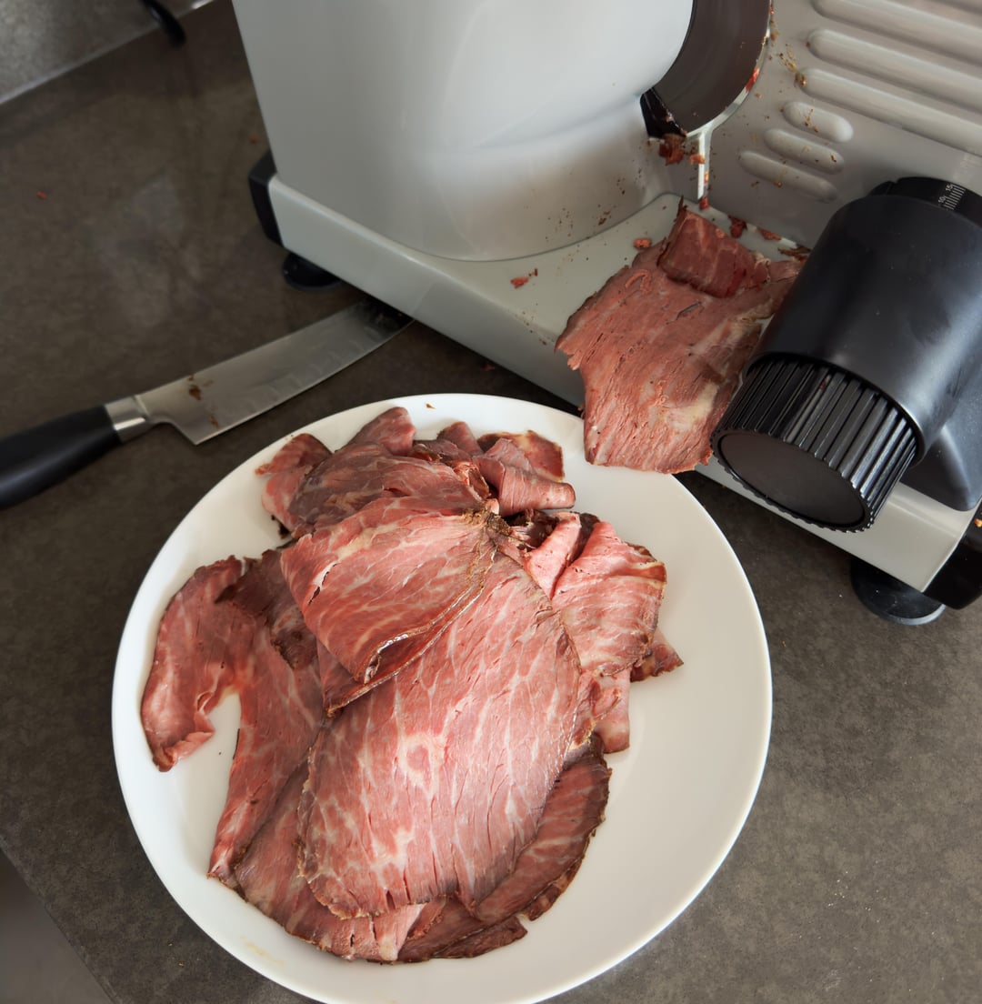 I made roast beef deli meat using a 24h sous vide cook. The meat is an incredible outside round roast from a wagyu hybrid. Usually this cut would be incredibly lean, took lean for my liking. But the wagyu meant lots of good marbling and juiciness.