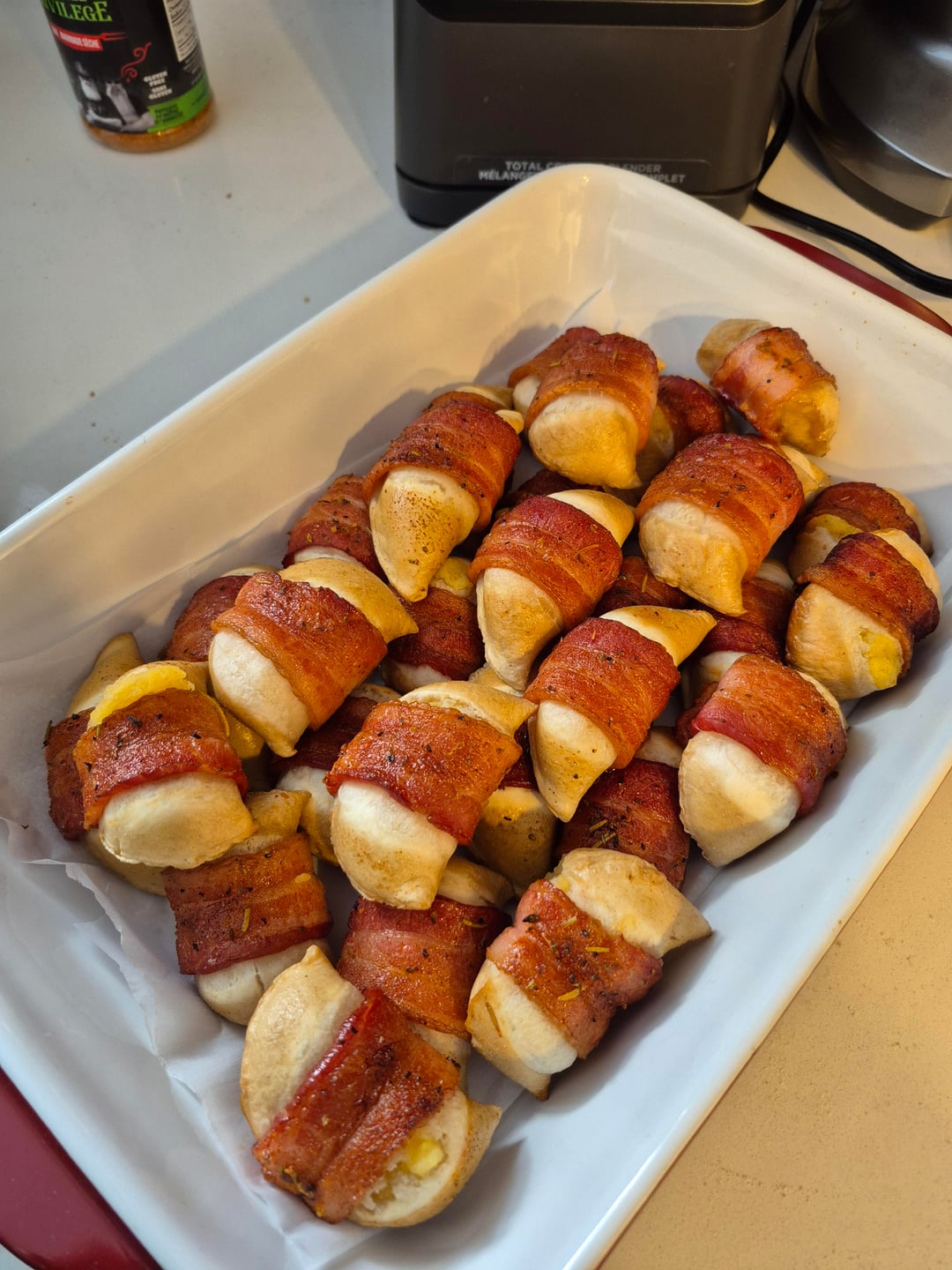 No name frozen pierogies wrapped with half a slice of bacon. Lightly seasoned with BBQ pit boys pork privilege.