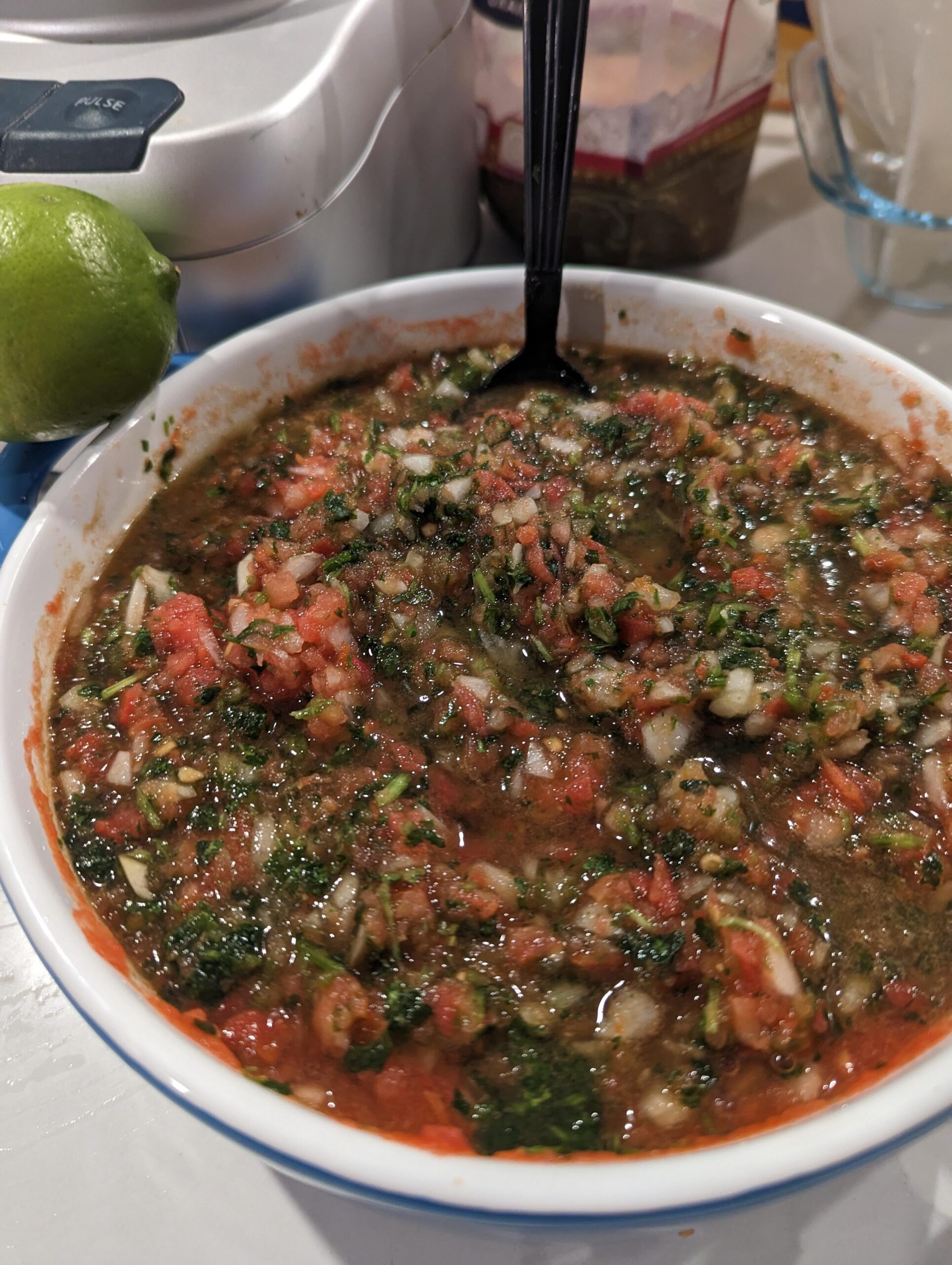 Simple recipe: Vine ripe tomatoes 🍅 white 🧅 onion, cilantro, salt, little bit of garlic powder.. And jalapenos