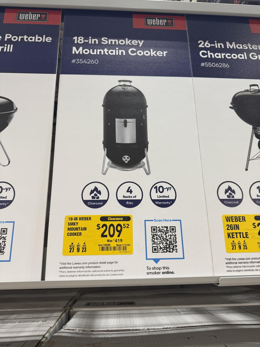 Damn, I can never find any of those deals at my local one. Looks like that 26 inch is also on sale. Also, why are they so consistent in miss typing it as a 19 inch smoky Mountain. It’s funny how long that has been going on for.