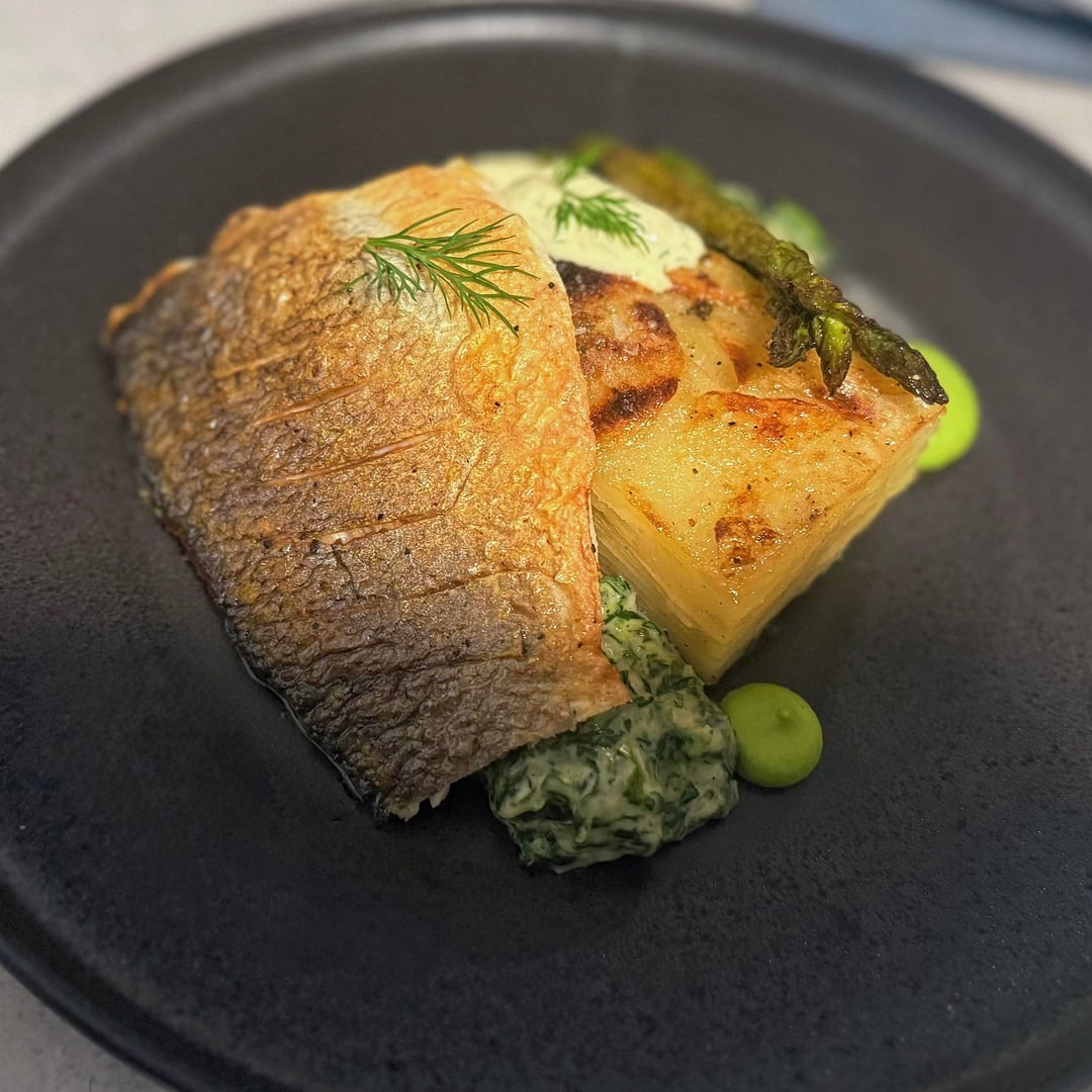 Sea bass – Potato dauphinoise – Pea Puree – Lemon dill sauce – Creamed spinach – Asparagus