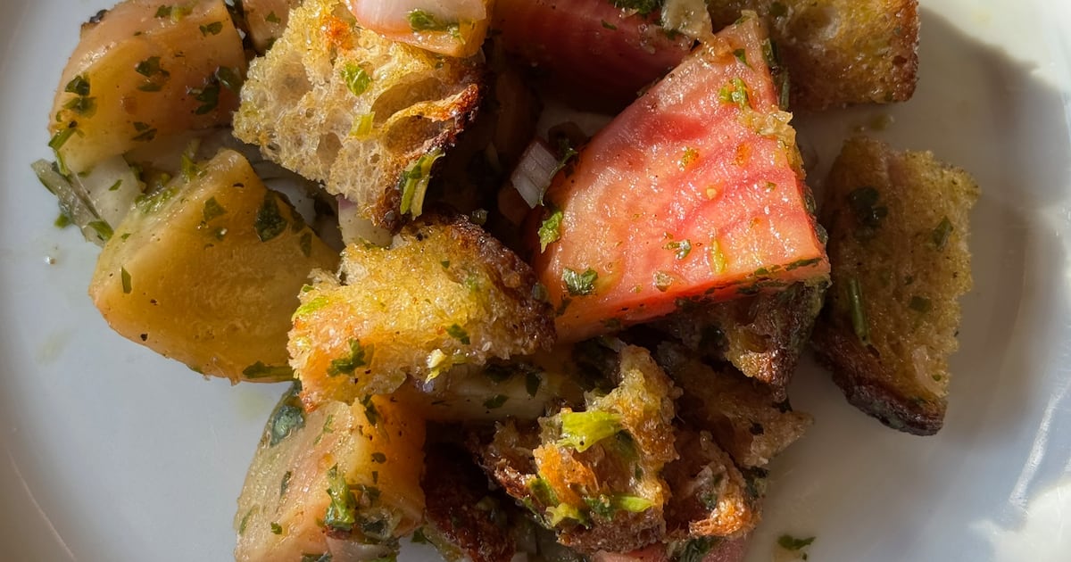 Summer’s really the time for the Italian bread salad called panzanella. Stale bread in Tuscany gets rehydrated with water, squeezed into a pulp, and mixed with ripe tomatoes, onions, red wine vinegar and good olive oil. There’s not much better on a hot day. But stale bread knows no season, and winter vegetables sometimes need the Italian treatment, too.