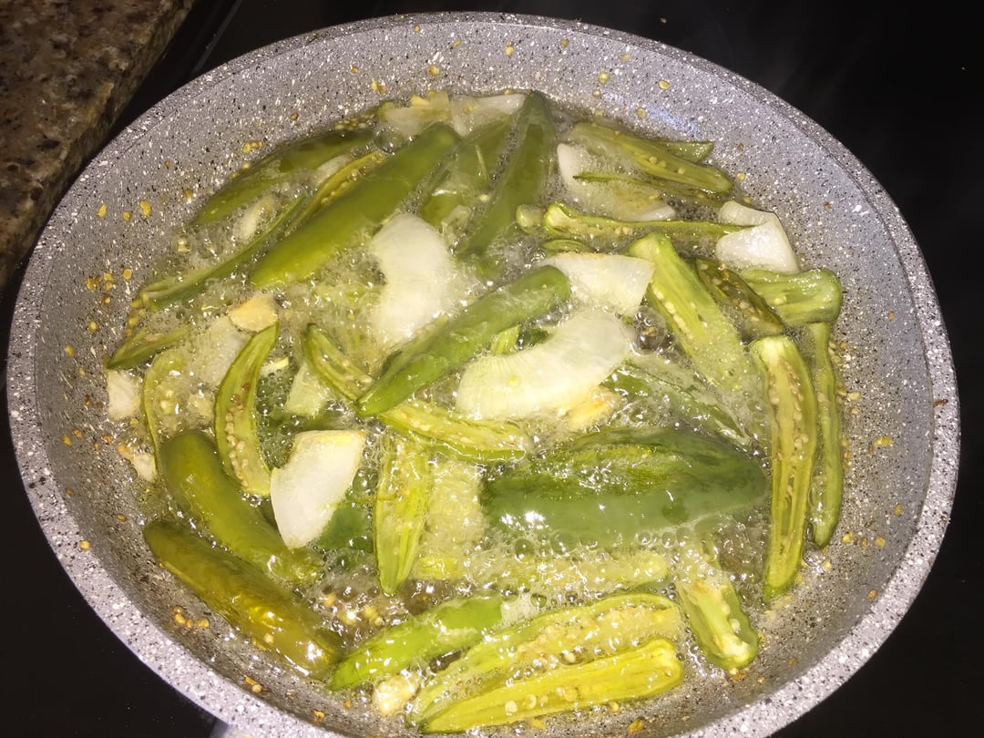 Frying pan full of split jalapeños and or Serrano’s
