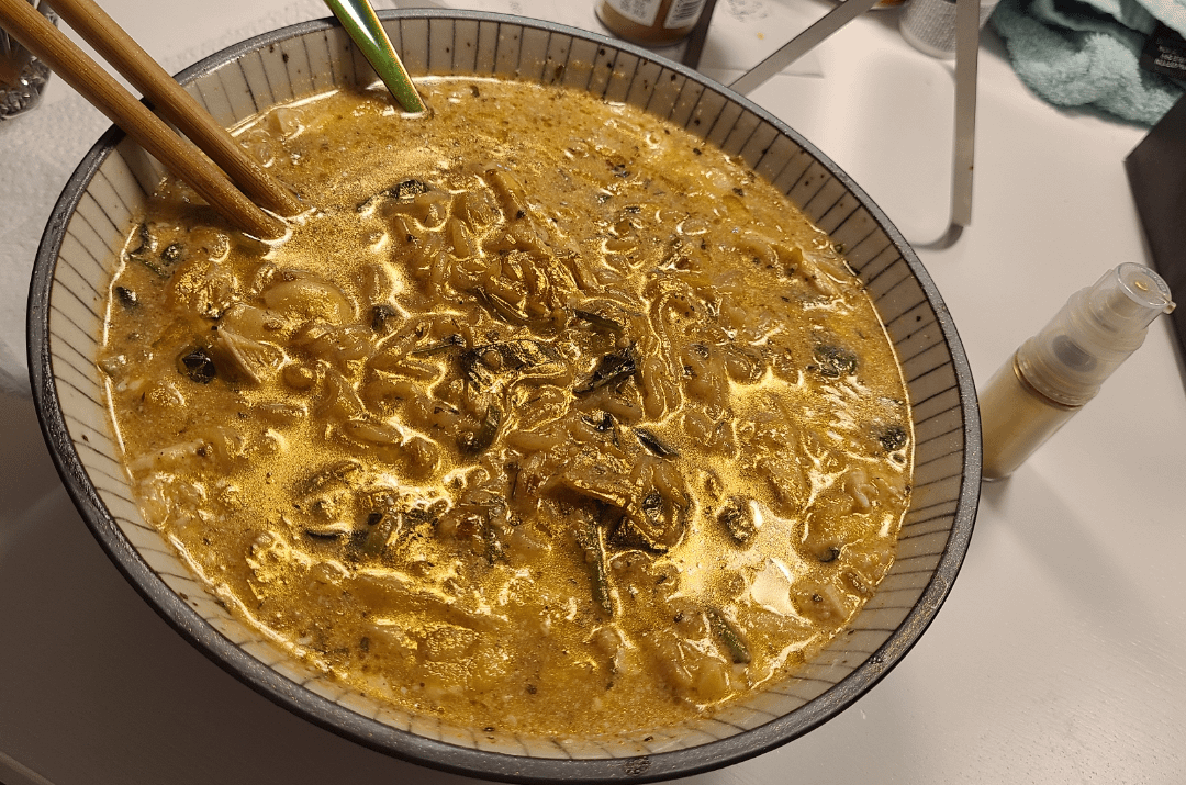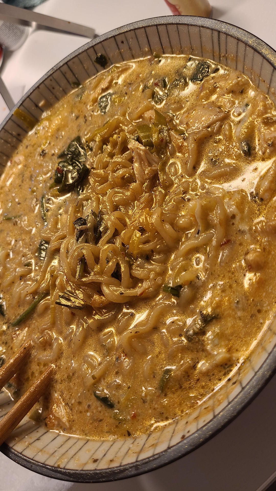 Kimchi packet noodles pimped out. Leeks, white pepper, spinach, cooked chicken I tore apart like a raccoon, dried onion flakes, fresh parsley I tore apart also like a raccoon, loads of garlic powder, mayo to make it creamy, organic olive oil missus brought, oxtail seasoning makes a come back here, vinegar, agar syrup, some beef broth seasoning thing in the cupboard, I can't remember what else. Drinking vanilla vodka and coke, obviously with the glitter in it again