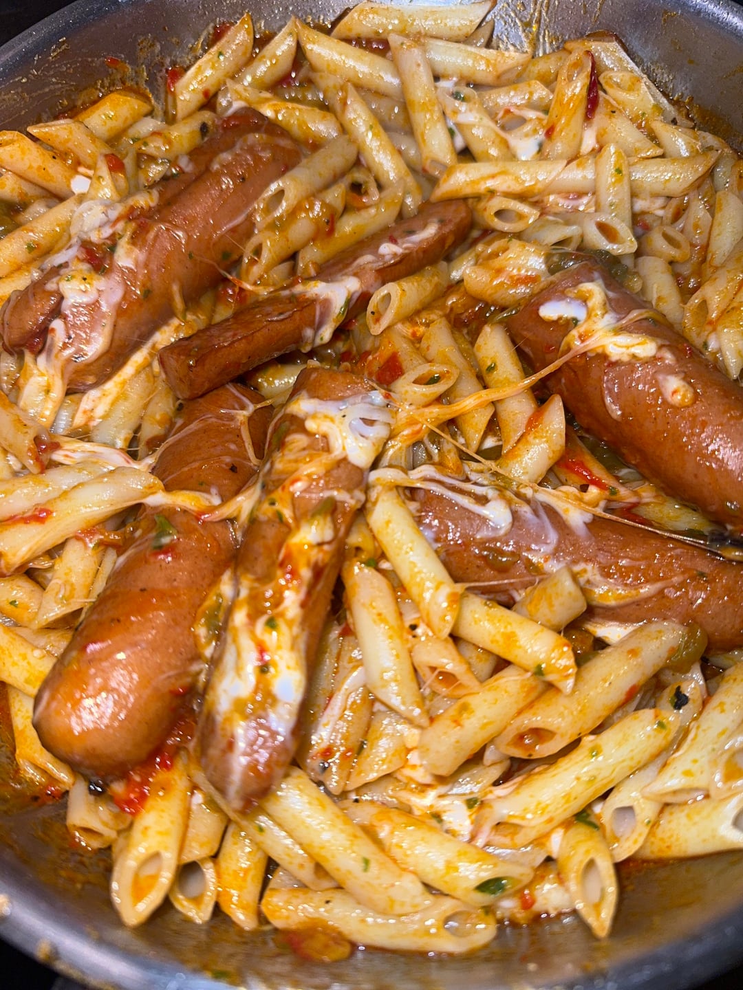 P1: Macarroni with sausages and mozzarella P2: Macarroni with tomato sauce sriracha and mozzarella // This is how I live when I have 14€ left til February. I eat one time a day😂