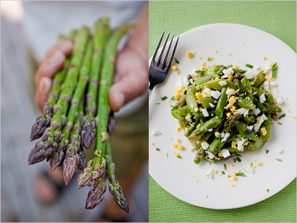 - In a salad bowl, whisk together the vinegar (or lemon juice and vinegar) and olive oil. Season with salt and pepper to taste. Add the asparagus, capers and herbs, and toss together. Add the chopped egg yolks and whites, then toss together again and serve.