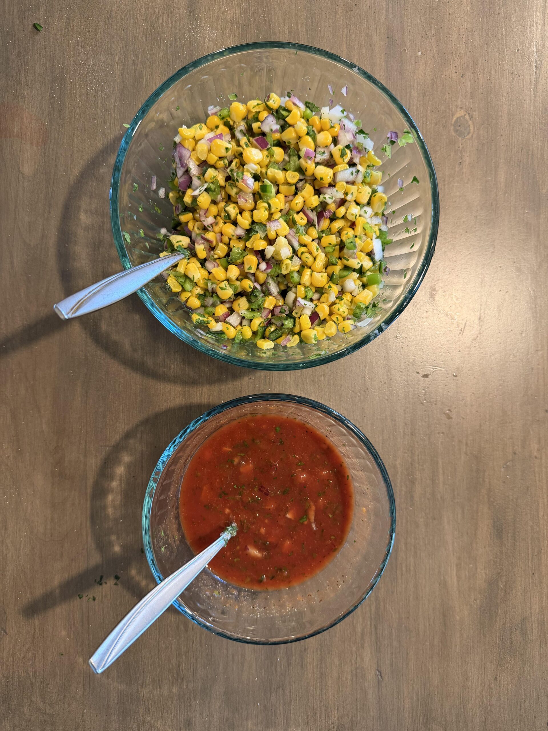 -Add a little bit of each of the leftover ingredients from the corn salsa, add a tiny bit of black pepper and garlic powder