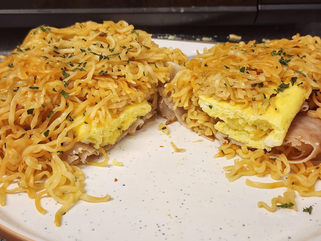 It's grilled turkey slices, a french omelet, and chicken Ramen that has been fried and wrapped around the previous two items.