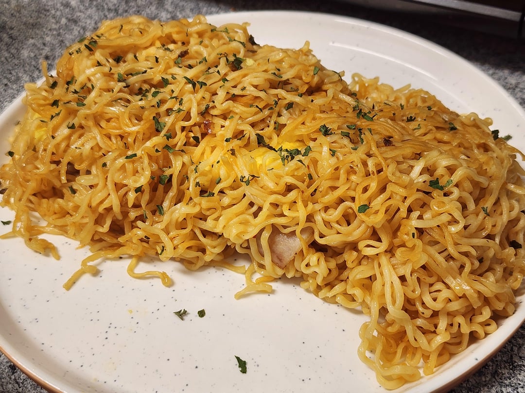 I often drain my instant noodles / Ramen, crack an egg in, and give it a quick fry but having the noodles on the outside opens up a whole new world of possibilities