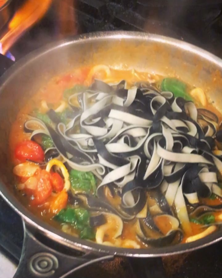 100% semolina two tone tagliatelle. The black side is dyed with squid ink and the white side is just semolina and water. The 2 doughs are laminated together during the rolling process to achieve the look I was going for in this dish.