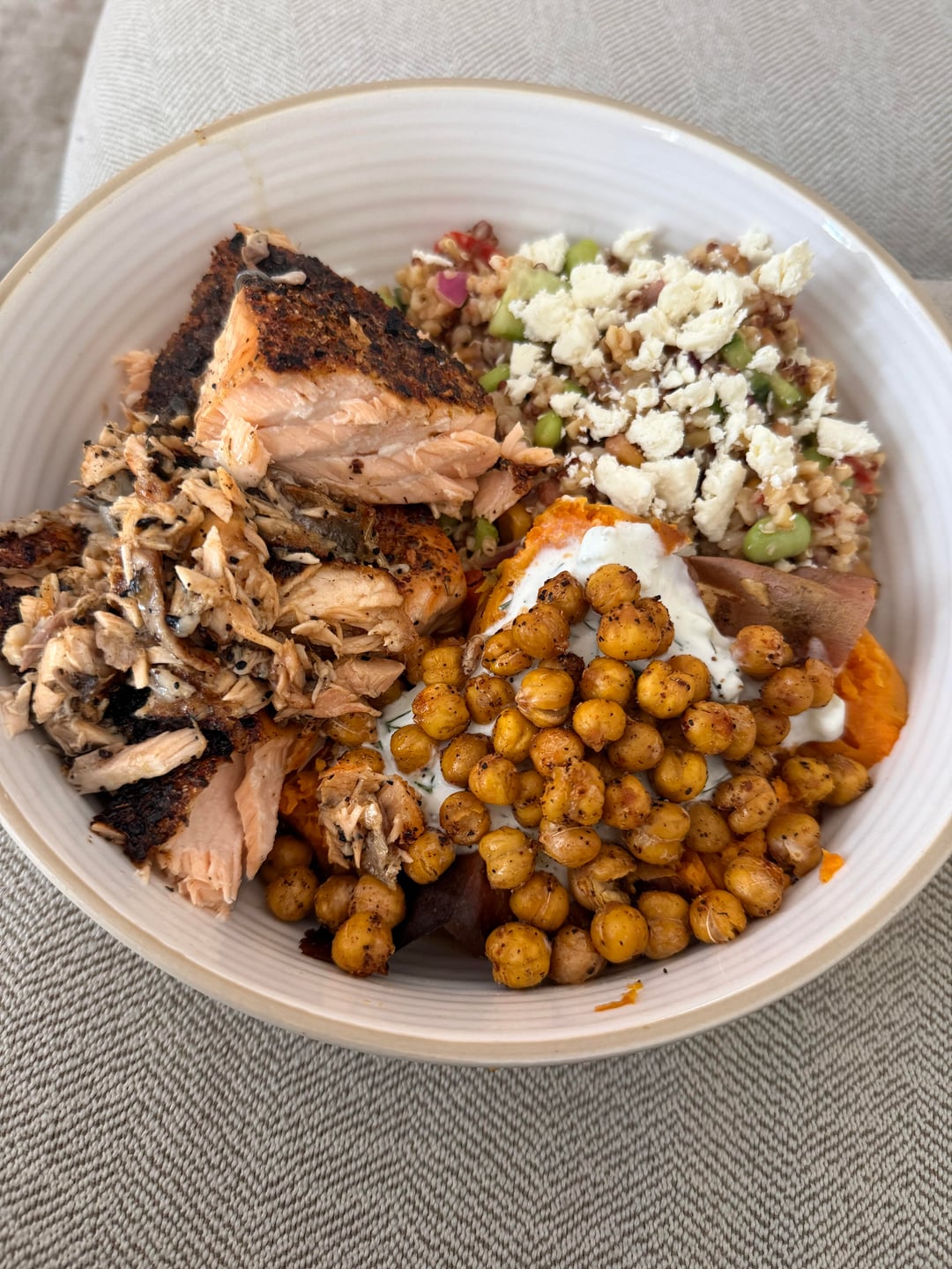 One day I had baked chicken breast. The other day is salmon. One day I had avocado with some balsamic glaze and on both days I’m eating a sweet potato with the sauce on top and roasted chickpeas..