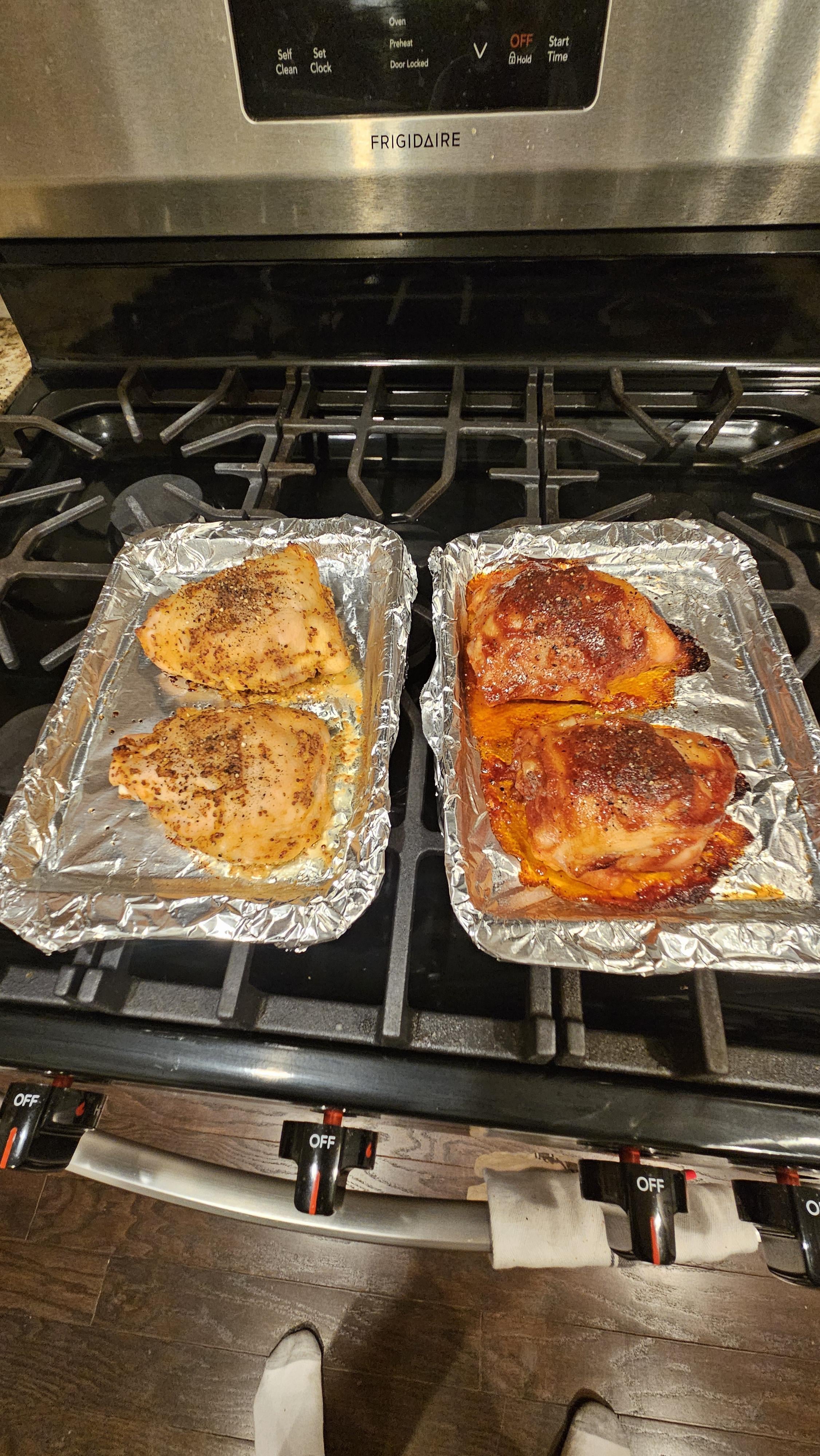 Put salt on chicken thighs last night, put them back in the fridge. Cooked them today, right side BBQ, left side mustard. Honestly I got too drunk last night and forgot I started the chicken.