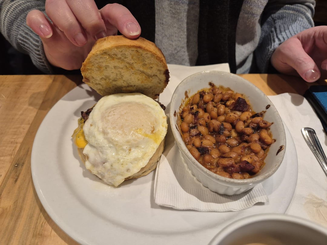 Had brunch again at Emma's today. I went for a short stack of Cinnamon Bun pancakes with a side of soft scrambled eggs and their in house made bacon, and my wife had a customized breakfast sandwich which included (among other things) pimento cheese and an over easy egg), as well as maple baked beans with bacon.