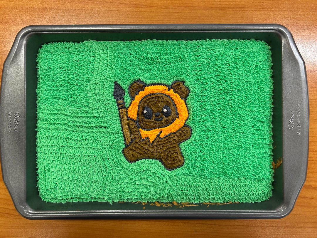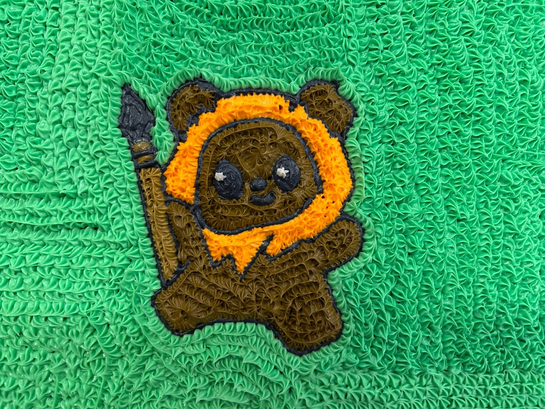I ran out of Star Wars cake pans on her last two birthdays so we’re on to free handing Ewoks. (Including pics of the cakes for the last two years as well).