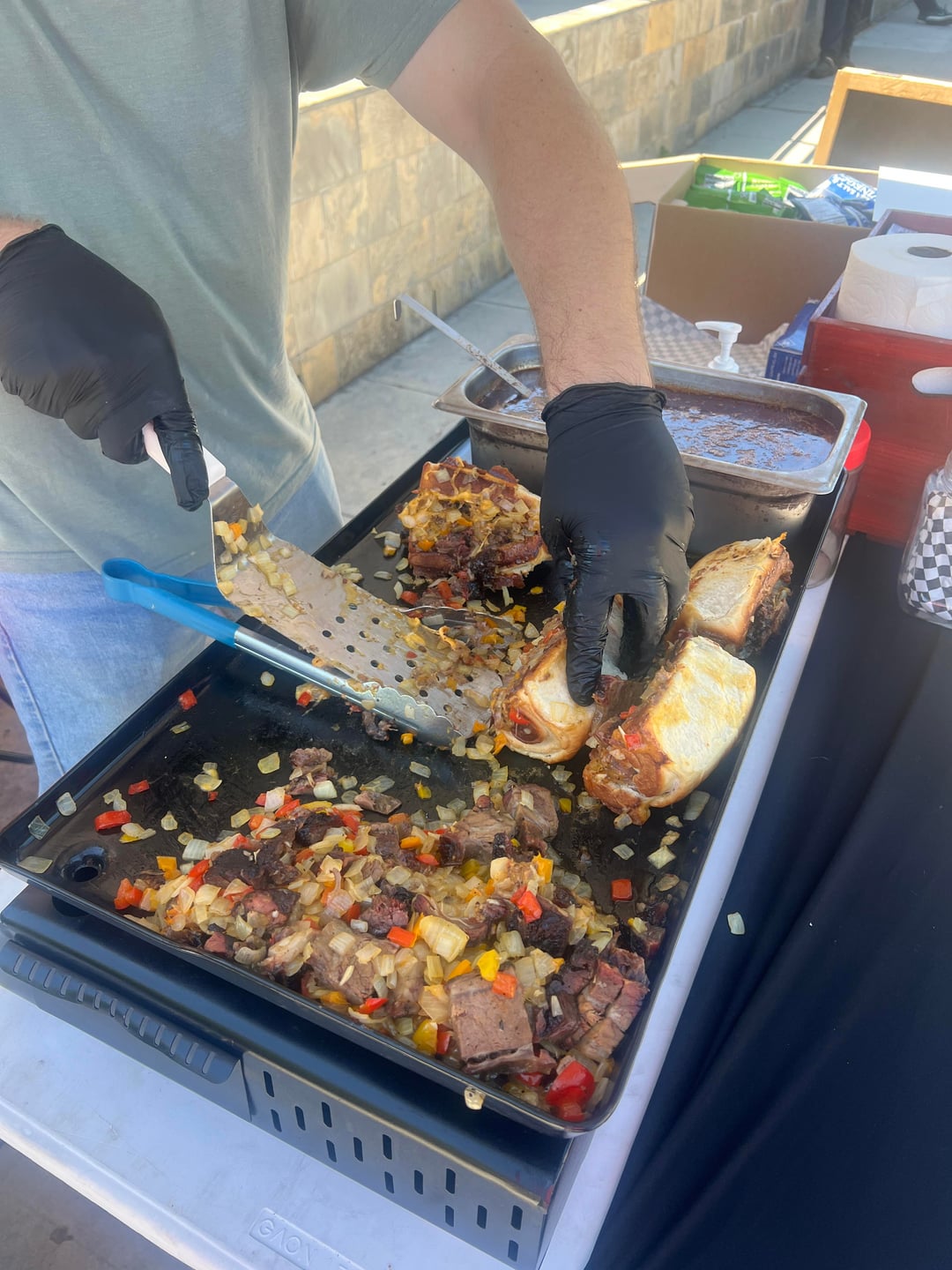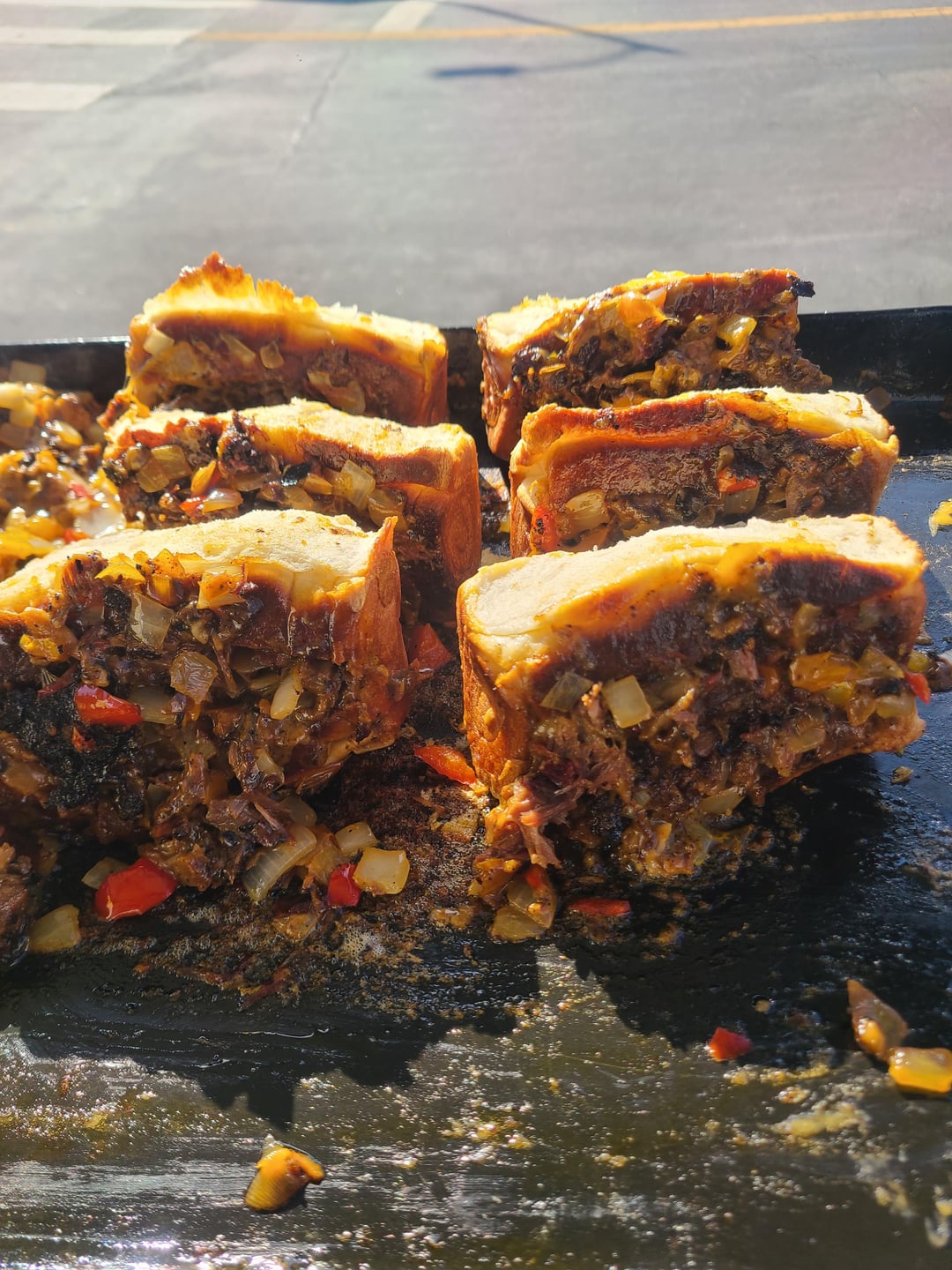 LA Cheesesteaks, smoked beef short rib, smoked and confit beef cheeks, onions, bell peppers, garlic and cheddar cheese on freshly baked, handmade rolls, with a handmade beef jus for dipping – $10, or 2 for $18.