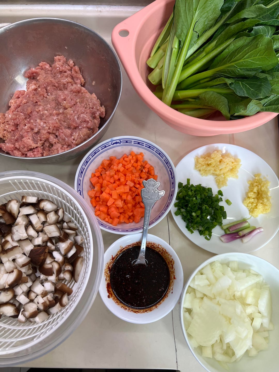 – 1kg minced pork marinated with some 2 tbsp cornstarch, 2tbsp cooking wine, 2tbsp soy sauce