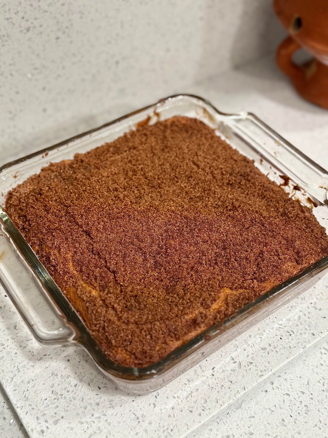 It probably would’ve baked better in a metal pan as glass does not produce evenly heated bakes. More specifically, light colored metal baking pans or sheets are best.