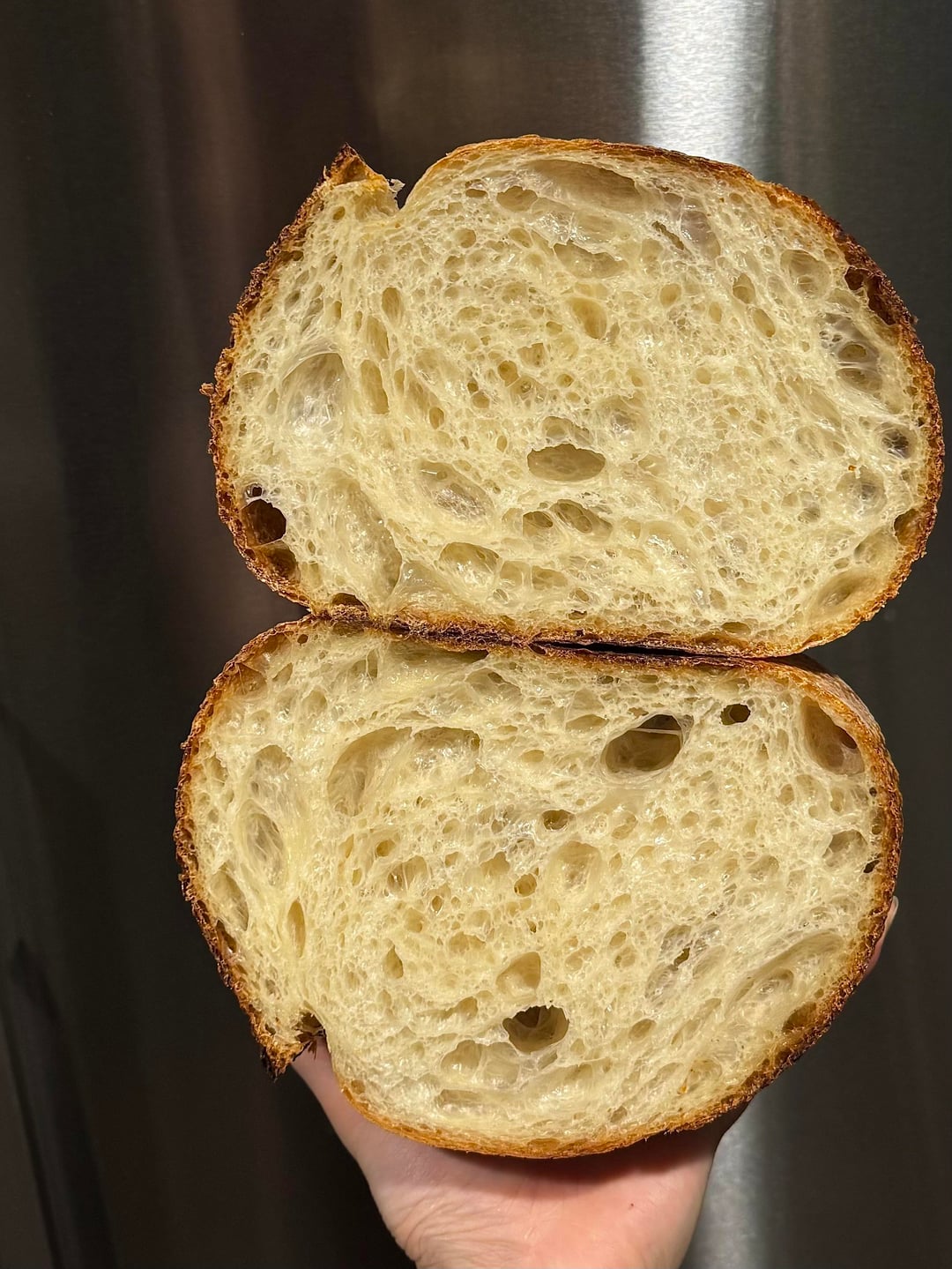 80% hydration 22% starter 2% saltA total of 8.5 hours of BF at 25 Celsius and another 12 hours of cold proof.by lmylm 3 Comments jawarcodz 10 hours ago This looks nice , did you open bake or Dutch oven? Fuzzy_Welcome8348 10 hours ago Looks wonderful! Hayasatoyne 5 hours ago perfect