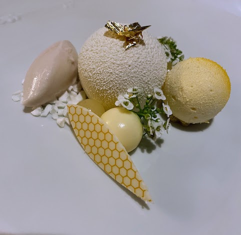 By now we were ready for something sweet, we’d finished our wine some time ago, a single bottle can only last so long even when sipped, and a dish called Honey -Crème fraiche mousse dipped in white chocolate, yuzu posset, yuzu confit, honey parfait and a milk and honey ice cream, garnished with white chocolate and alyssium, was intriguing, sweet with the honey and tart with the yuzu, a perfectly balanced dish and palate cleanser.