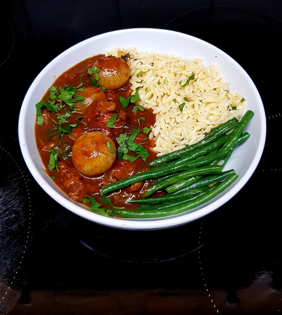 Greek Stifado with Pork Shoulder. Served with Orzo Pasta and Sautéed Green Beans.by pink_flamingo2003 Dining and Cooking