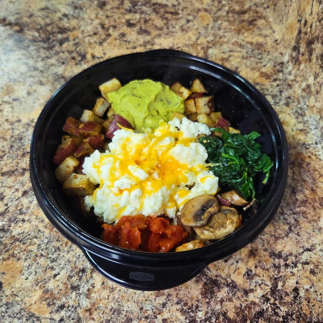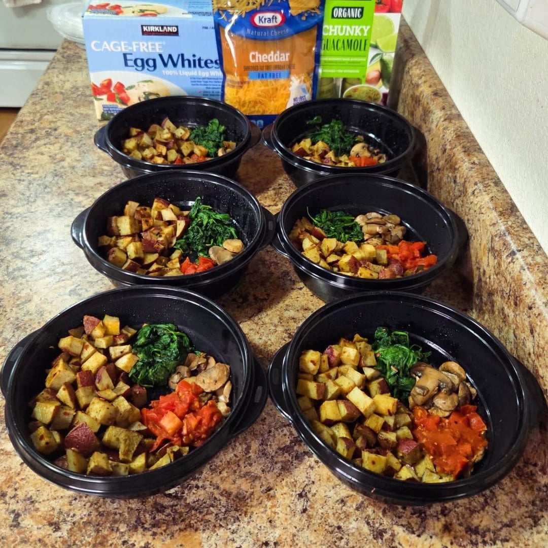 Breakfasts Bowls: diced red potatoes tossed in olive oil, salt, pepper, onion powder, sage, fennel, smoked paprika and oven roasted. Sautéed baby spinach, diced tomato and sliced mushrooms. Each morning I scramble egg whites, topped with shredded cheddar and a guacamole cup.