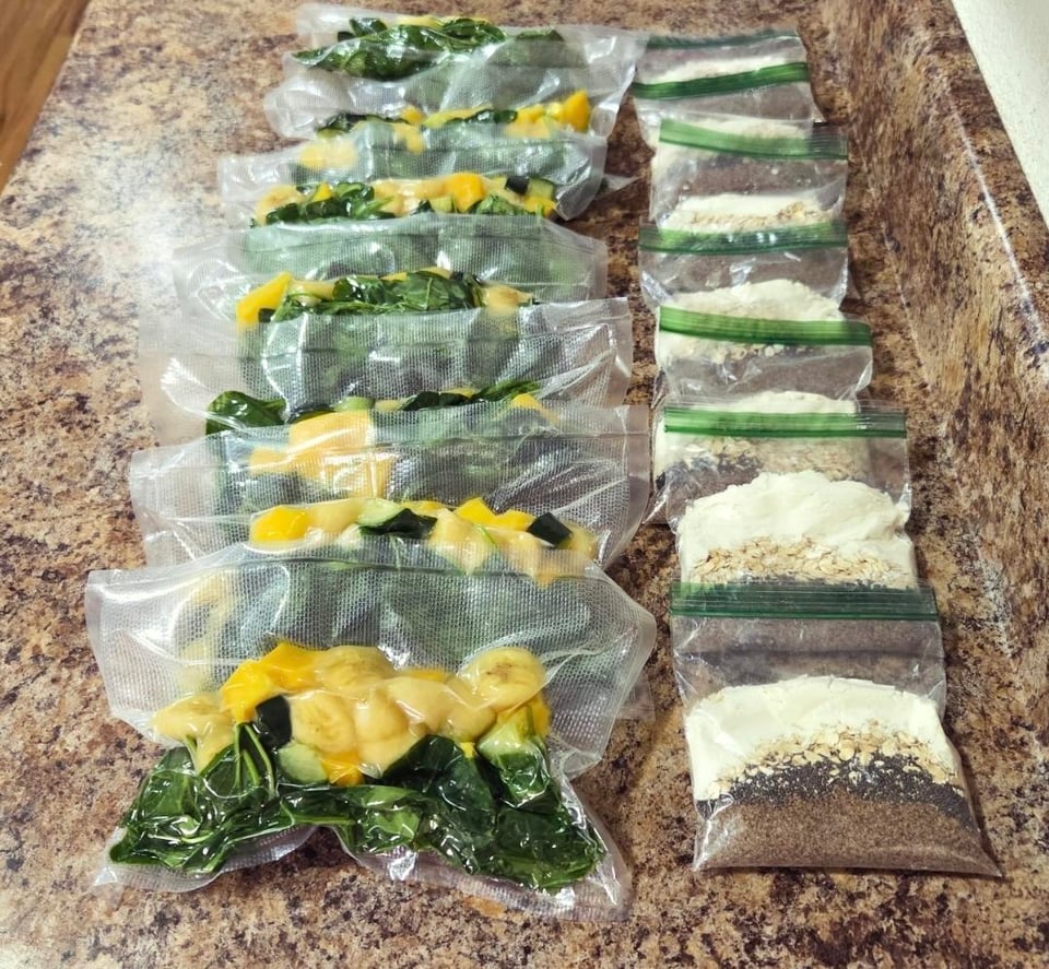 Snacks: smoothie freezer bags with baby spinach, diced mango, banana and cucumber. Dry ingredients bags with chia seeds, ground flaxseed, old fashioned oats and vanilla whey protein powder. Blend your fruits and veggies first with water, then add your dry ingredients and blend a second time.