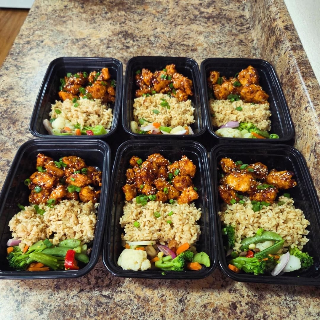 Lunches: sweet and spicy sesame air-fried chicken with brown rice, steamed mixed veggies and garnished with sesame seeds and green onion. This chicken is so delicious!