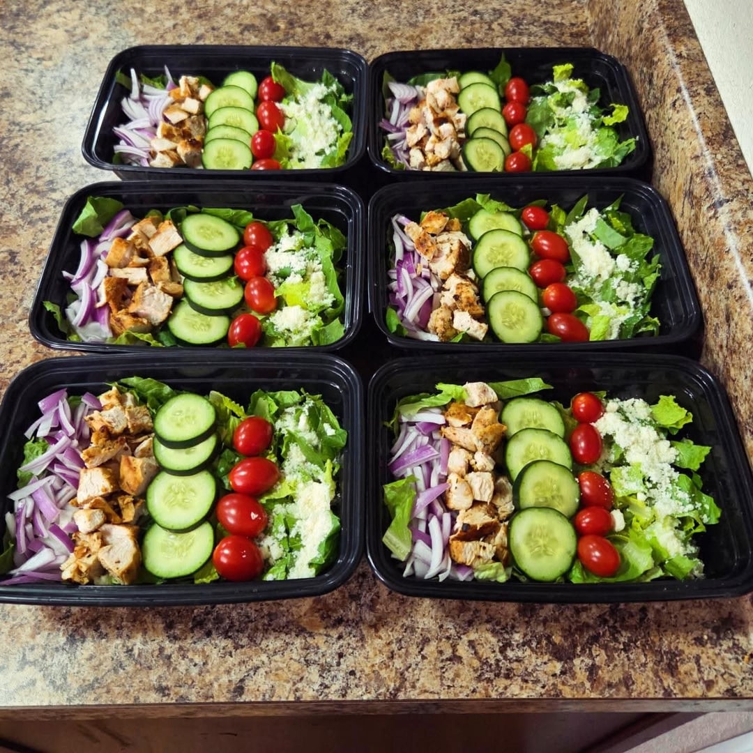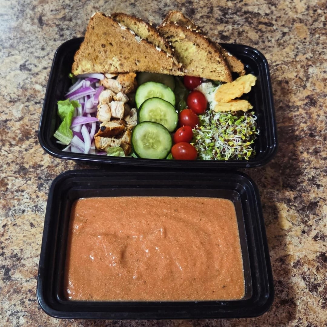 Dinners: green salads with Romaine lettuce, red onion, diced pan seared chicken breasts, cucumber slices, grape tomatoes, five cheese dry blend, parmesan crisps and homegrown broccoli sprouts. Topped with lite creamy Caesar dressing. Two pieces of multigrain toast with grass-fed butter. Side of protein tomato soup.