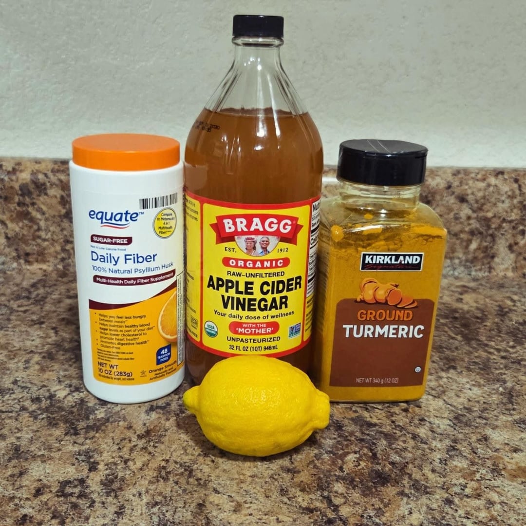 Wellness Drink: 1 cup water, 1 shot (1.5 Oz) apple cider vinegar, 1 lemon's juice, 1 tsp turmeric powder, 1 tsp orange flavored psyllium husk powder. No prep needed, just mix up each morning and enjoy with breakfast. This drink provides prebiotic fiber, digestive enzymes, Vitamin C, is anti-inflammatory and hydrating.