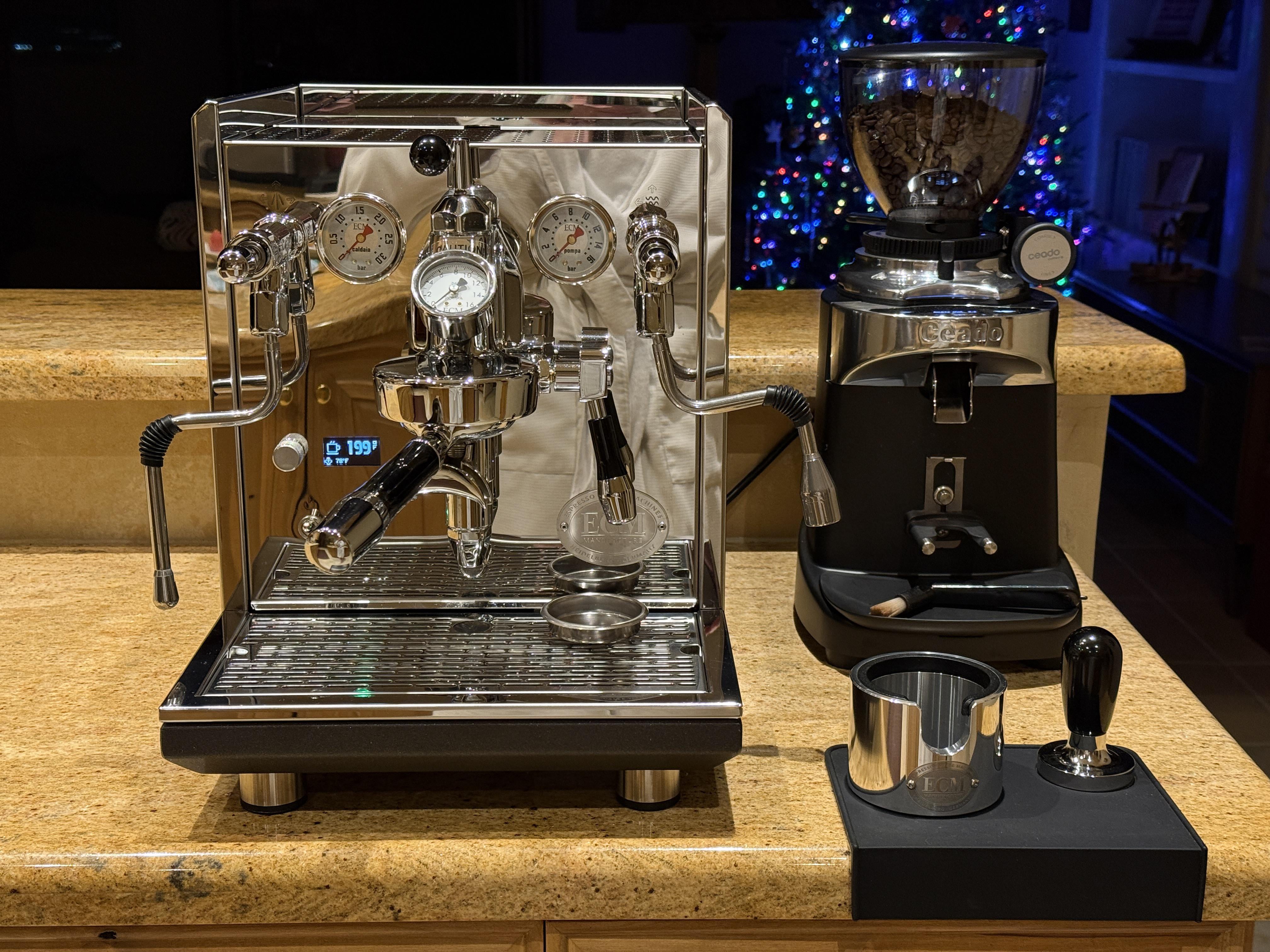 ECM Synchronika II, Ceado E37S. Puddles of water under my old machine led me to remove the cover and ultimately find seepage and corrosion from one of the welds on the boiler. After 22 years with a Pasquini Livia 90. For me, it’s the espresso equivalent of going from walking across the street to landing on the moon.