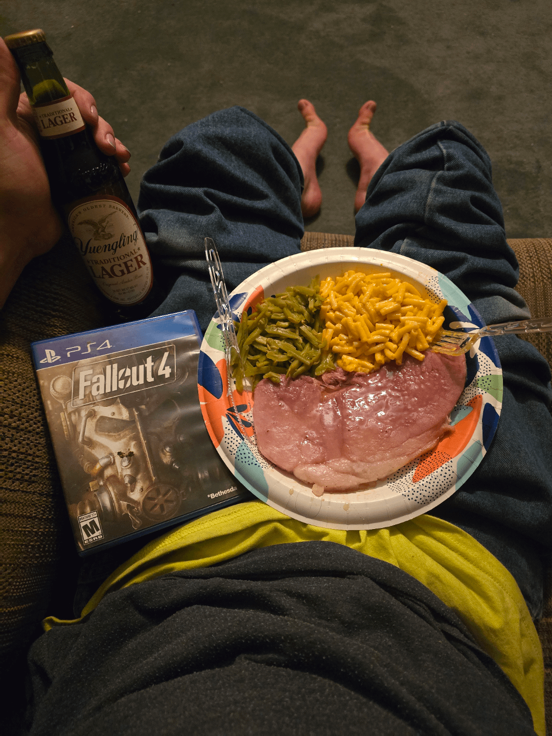 Ham steak, Kraft Mac, green beans, and my Yuengling.