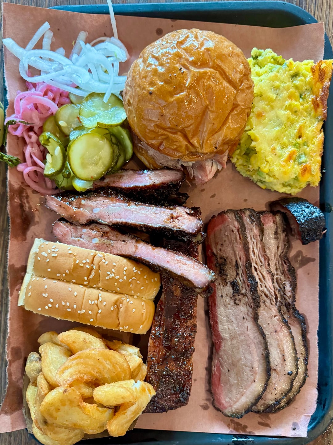 My favorite outside of Texas. 1/2lb brisket, 4 pork ribs, 1/2lb pulled pork sando, tallow fried spiral cut fries, green chile corn pudding. Pricey but always great.