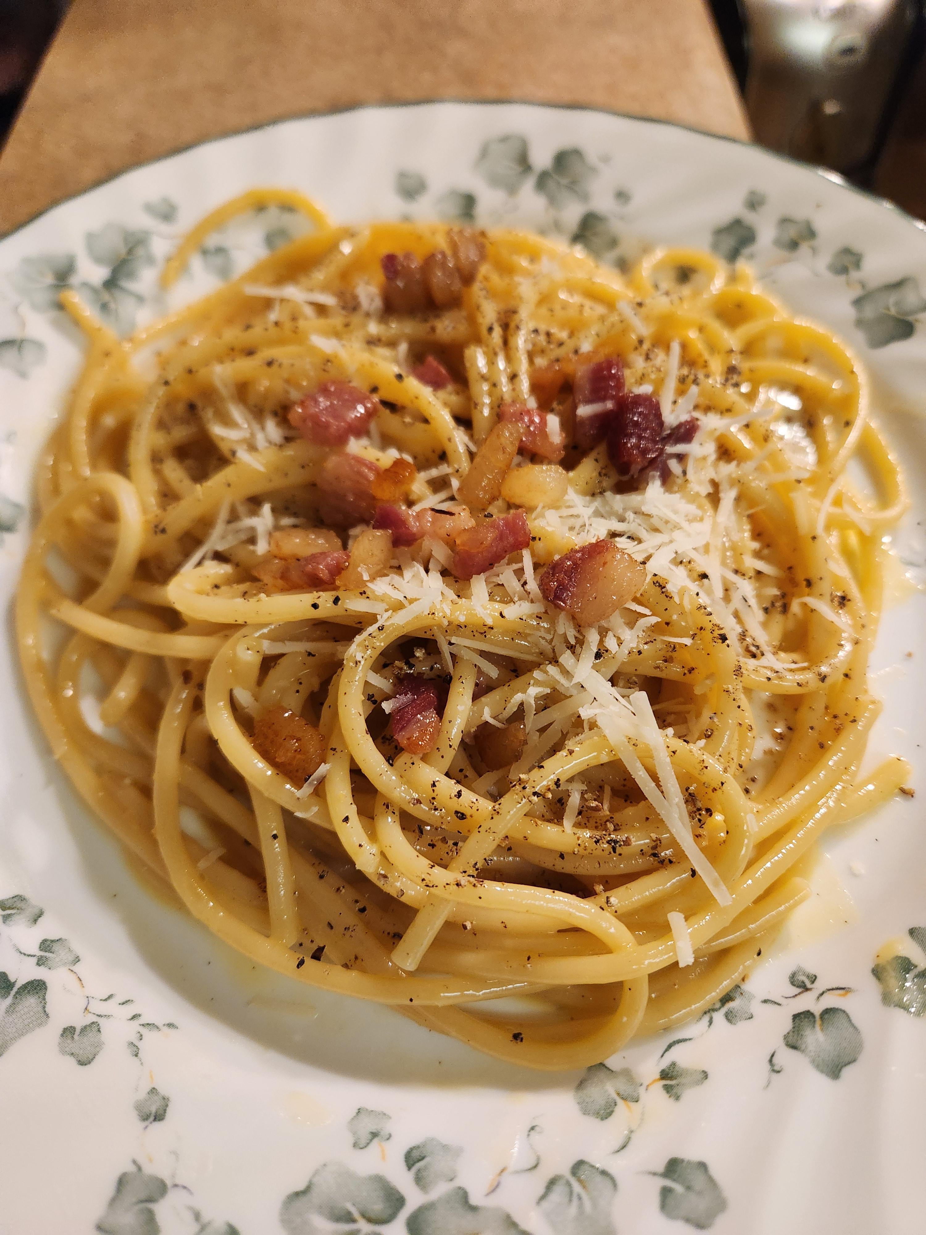 First try at pasta alla carbonara. Let me know if you have feedback, it tastes amazing I think a little more pasta water but satisfied with the results. 😋