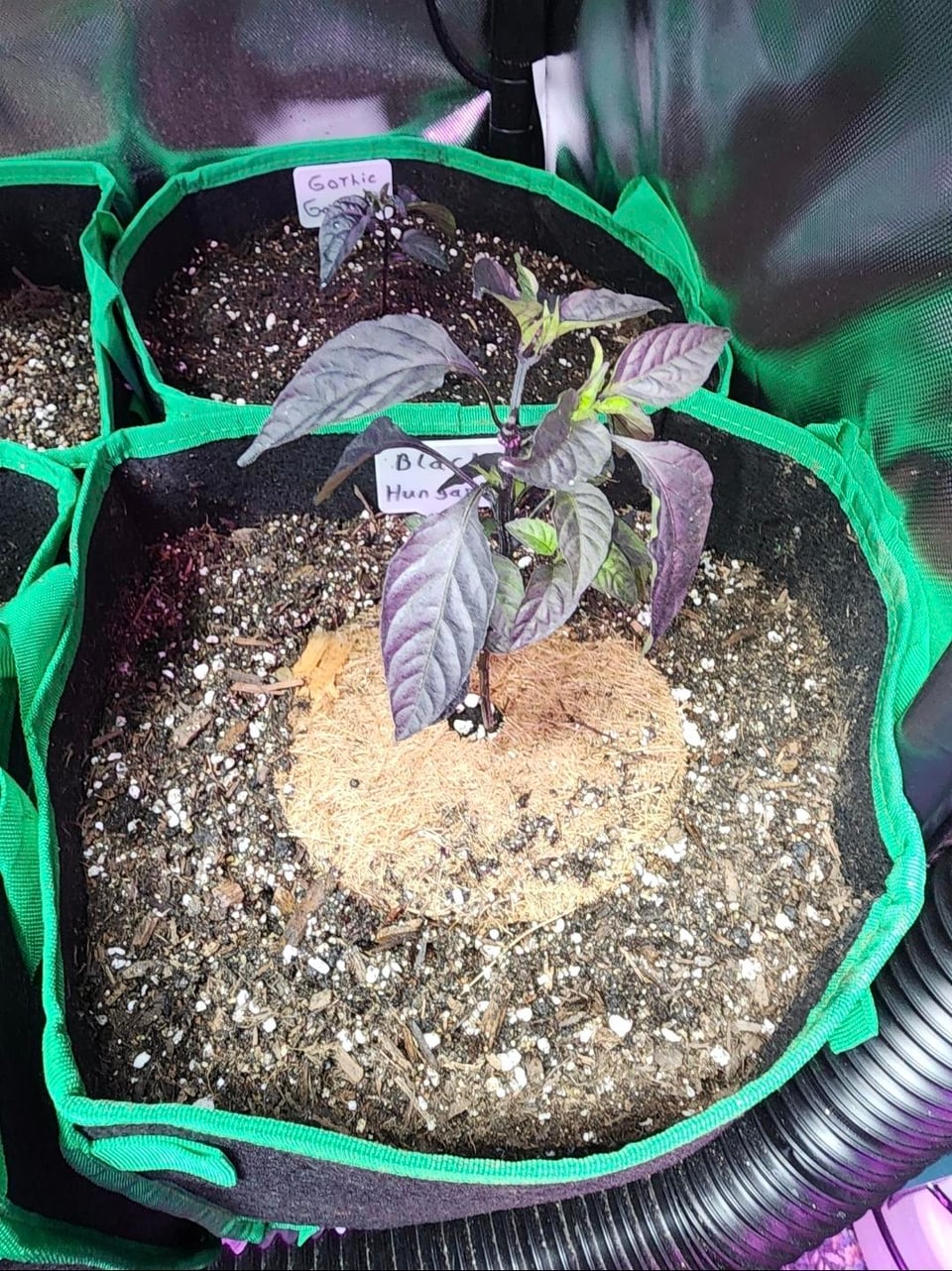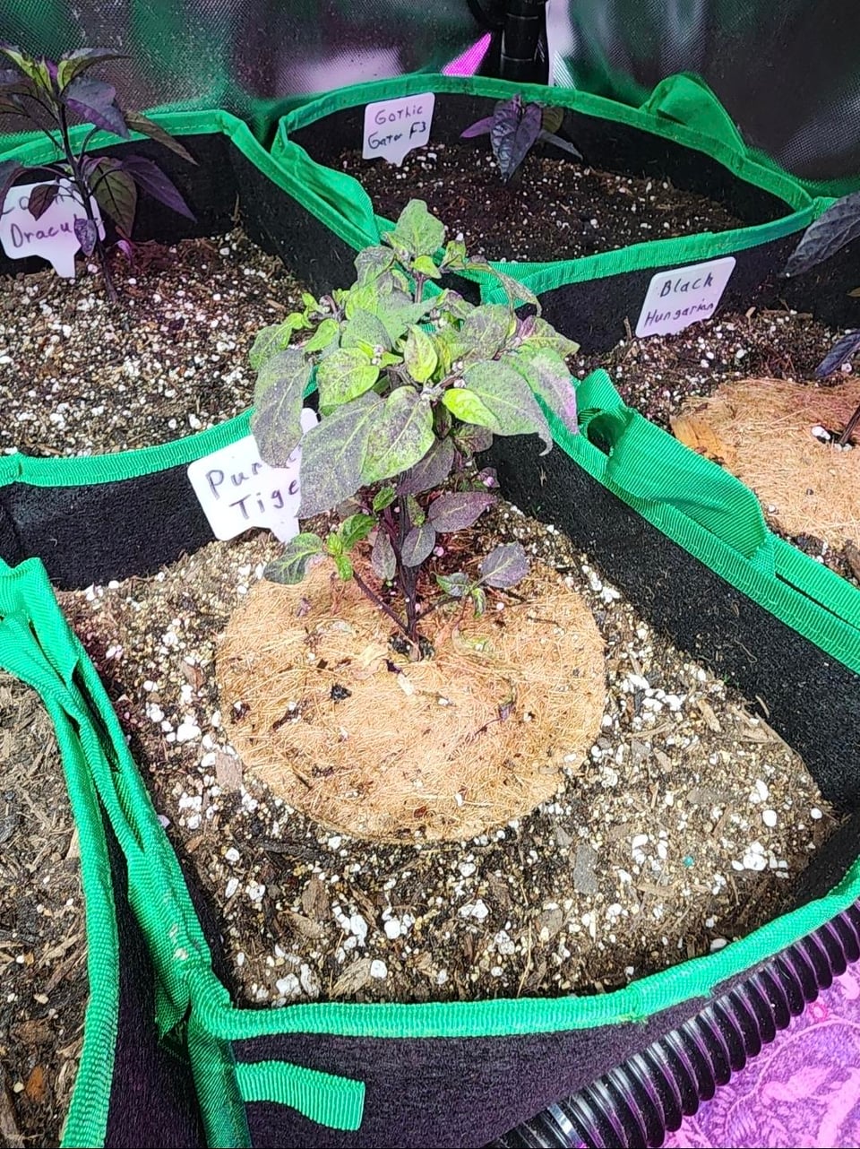 I took the 10 best growing varieties and potted them up to 3 gallon grow bags. Managed to fit them all in my secondary chamber rack and I even added the billboard style labels to make them look more official.