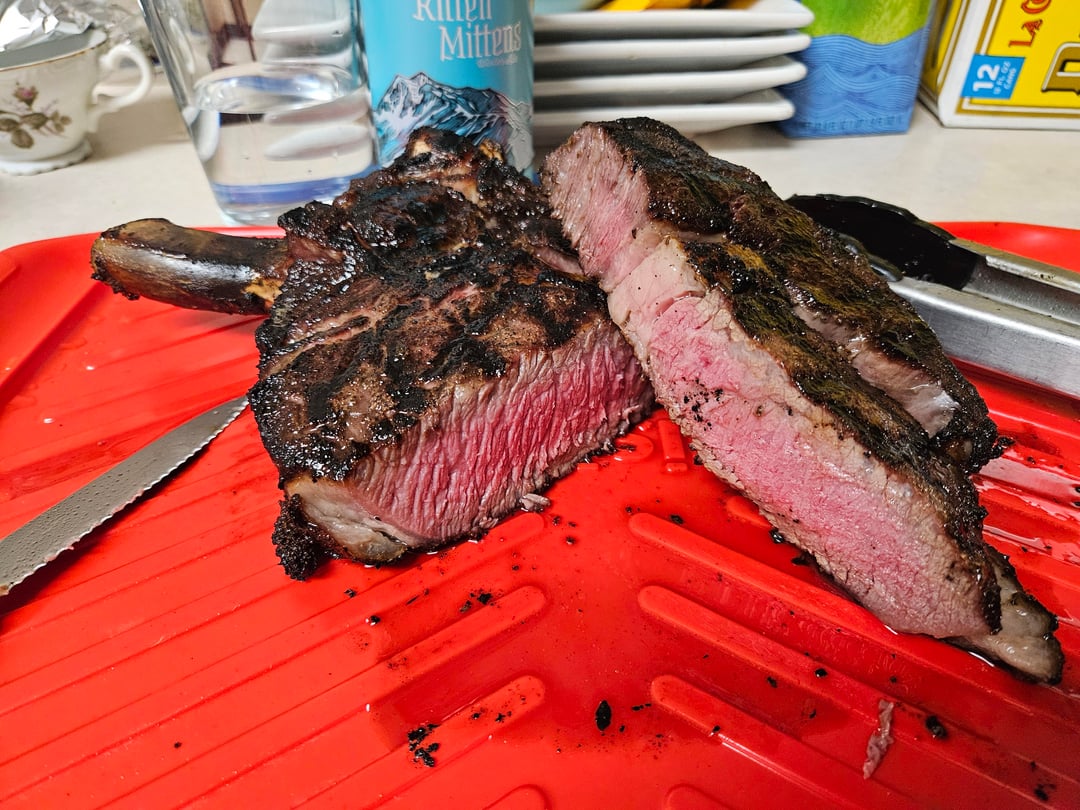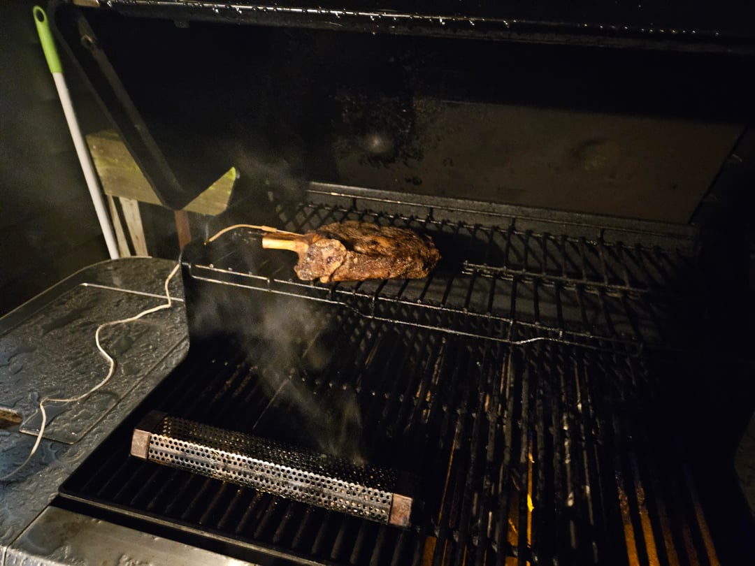 This summer I was considering buying a smoker, but I didn't really feel like forking out the dough and I didn't really have the real estate to accommodate one either. Then I saw these stainless tubes for $20 for a pair. Fill em with pellets and blaze up one end like a cigar. You get 4 solid hours of smoke on a tube. Ive been messing around with them for months, and although I've still never gotten that beautiful purple smoke ring on any of my stuff, the flavor is phenomenal. Well, tonight in the rain, I think i made my finest steak I've ever done. 2lb "cowboy cut" ribeye. Had the far right burner on lowest setting, which kept the ambient at 90°f. Got a solid 2 hours of smoke before the steak internal reached 85, then I turned up the heat and held the grill at a perfect 107, and I pulled off the steak when the internal temp was 105. Cranked up the sear zone to 500 before I turned the heat down to 7/10 power and then blasted the steak like I would do a regular 3/4" raw steak. Behold